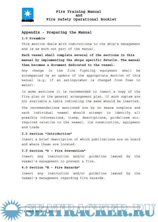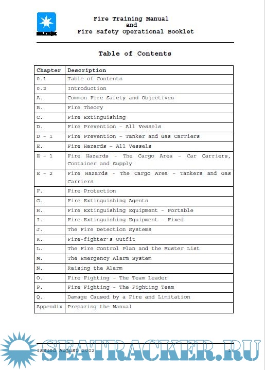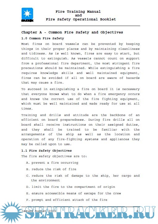 Year: 2002 Language: english Author: Maersk Genre: Manual Format: PDF Quality: eBook Pages count: 78 Description: The Fire Safety Training Manual and the Fire Safety Operational Booklet has been prepared to provide all members of the crew with instructions and information about general fire safety and precautions in order to prevent loss of life, and damage to the ship and her cargo. The Fire Safety Training Manual and the Fire Safety Operational Booklet complies with the amendments to SOLAS Chapter II Regulation 15 and 16, which came into force on 1st July 2002. A copy of The Fire Safety Training Manual and the Fire Safety Operational Booklet shall be provided in each crew mess room and recreation room or in each crew cabin. Each crewmember must possess an intimate knowledge of this manual, enabling the individual to contribute to safety on board the vessel.