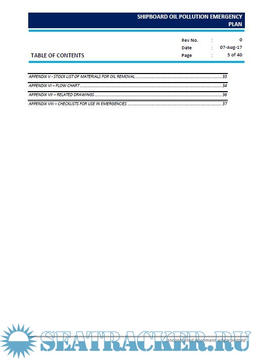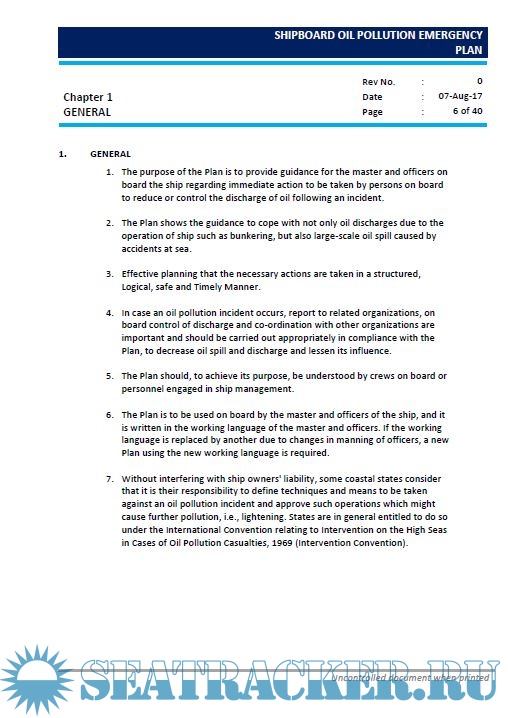 The Plan contains all information and operational instructions required by Regulation 37 of ANNEX I of MARPOL73/78 Convention, "the guidelines for the development of shipboard oil pollution emergency plans issued by International Maritime Organization (IMO) in Res. MEPC 54 (32) and as amended by MEPC 86 (44)". The appendices contain names, telephone, and telex numbers, etc.,of all contacts referred to in the Plan as well as other reference material.