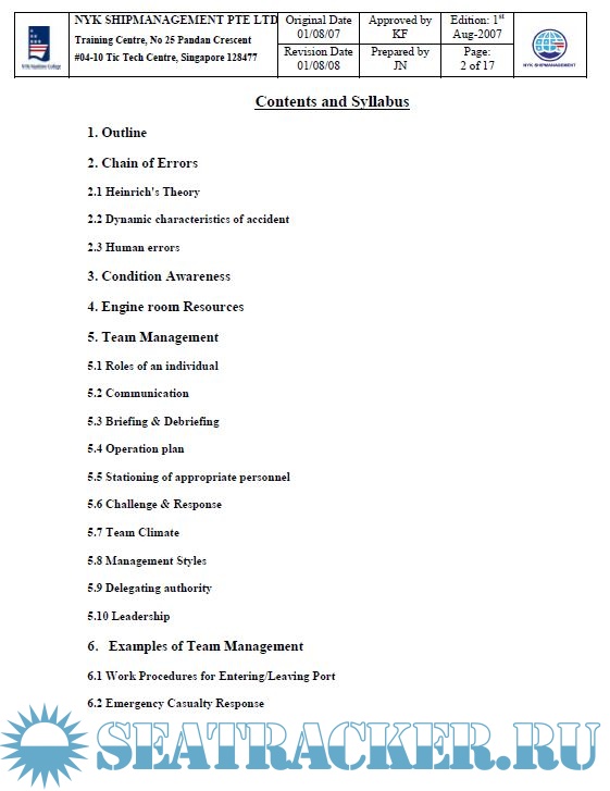 Year: 2008 Language: english Author: NYK Maritime College Genre: Training courses Publisher: NYK Maritime College, Singapore Edition: 1st Format: PPT Quality: OCR without errors Pages count: Multiple Description: Course Code: NMC 22 Course Name: Engine Room Resource Management Training Duration: 2.5 Days Objectives of the Training After completion of the training, the trainees should understand the followings: 1) Management of human resource (Engine crews) 2) Communication skills 3) Emergency responses 4) Human involvement in errors.