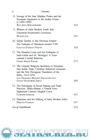 The various papers deal with such themes including interconnectedness between Africa and India, trade and urbanity in Golconda, the changing meanings of urbanization in Bengal, commercial and cultural contact between Aceh and India, changing techniques of warfare, representation of early modern rulers of India in contemporary European paintings, the impact of the Indian Ocean on the foreign policies of the Mughals, the meanings of piracy, labour process in the textile sector, Indo-Ottoman trade, Maratha-French relations, Bible translations and religious polemics, weapon making and the uses of elephants.