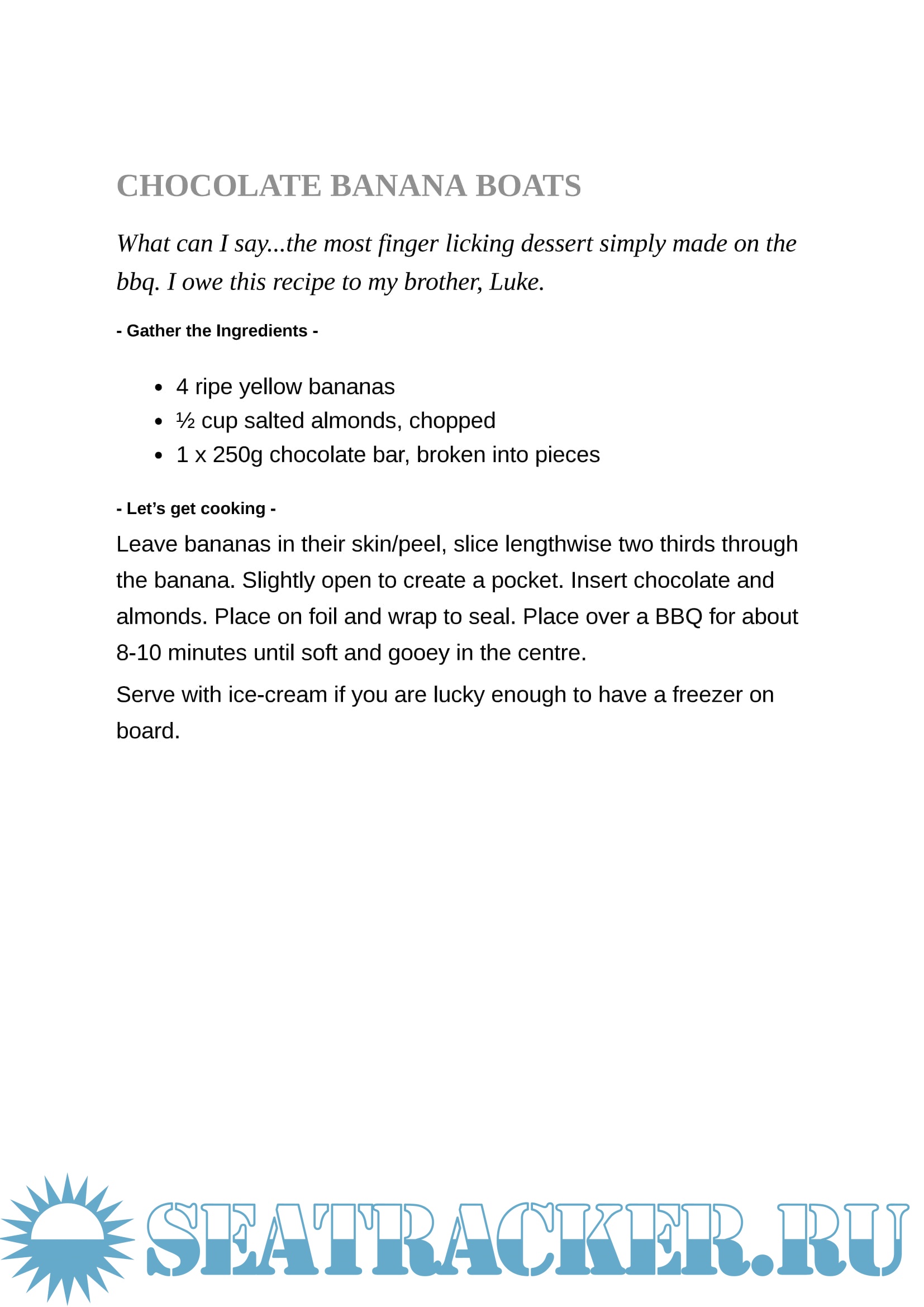 ABOUT THE COOK SUN, MOUNTAINS AND SEA... GALLEY NOTES BASIC ESSENTIALS: EQUIPMENT PANTRY BASICS STORAGE SEA SICKNESS REMEDIES BE MINDFUL OF... WHAT’S COOKING.... ABOVE DECK - BREKKY Fluffy Orange Pikelets with Caramelised Fruit and Golden Goddess Caramel Coconut Sauce Smashed Black Pepper Strawberries, yoghurt and honey pots 5 minute Granola Plum Lemon and Amaretto Cake Greek Style Eggs Brekky in a hurry – Baked feta JR’S Scrambled Eggs Decadent Bacon Butty or Sarni Bouncer 3 WAYS WITH... CABBAGE Italian Slaw Cabbage Salad Asian Slaw Pickled Cabbage POTATOES Creamy Warm Potato Salad Indian Potatoes Bubi’s Potato and Cucumber Salad RICE Ginger and Orange Rice Jewelled Rice White Rice Cucumber and Chilli (Sushi Salad) TUNA 3 alternative recipes SALADS 3 Melon, Feta, Olive, Onion and Parsley Salad Beetroot with Mint and Feta Summer Lentil Salad Green Bean and Feta Salad Carrot and Raisin Salad MANGIA! MANGIA! PASTA Ragazzi Penne Peppers and Almond Pasta Chicken in Red Sauce FRUITS OF THE SEA Prawn and Feta Saganaki Greek Style Pan-Fried Fish Psari Savori Tuna Fish Cakes FEELING CHEESY Baked Camembert Stuffed Peppers Cheesy Balls Feta and Sundried Tomato, Oregano Impossible Pie MEATY Meatballs with a twist Pork, Honey and Rosemary Kebab’s Seaside Chicken Genovese Dedi’s Chicken Wings DROP ANCHOR – NIBBLES WITH DRINKS Marinade for Olives Bar Nuts Quick pickled Carrot and Cucumber Sticks with Labna Triple Deck Baked Greek Cheese Soldiers Courgette/Zucchini Bruschetta SWEET DREAMS Chocolate Banana Boats Rich Caramel Apple Crumble Chocolate and Coffee (BIRTHDAY) Cake Baked Yoghurt Peaches BEVERAGES Ouzo Retsina Tsipouro Raki Mastika liquor Frappé Coffee STAPLES Caramelised Fruit Toasted Rice 1,2,3 Flat Bread Creamy Salad Dressing Tahini Dressing Simple Pasta Mustard Salad Dressing Marinated Raisins Caramelised Onions Labna 5 Ingredient Salsa