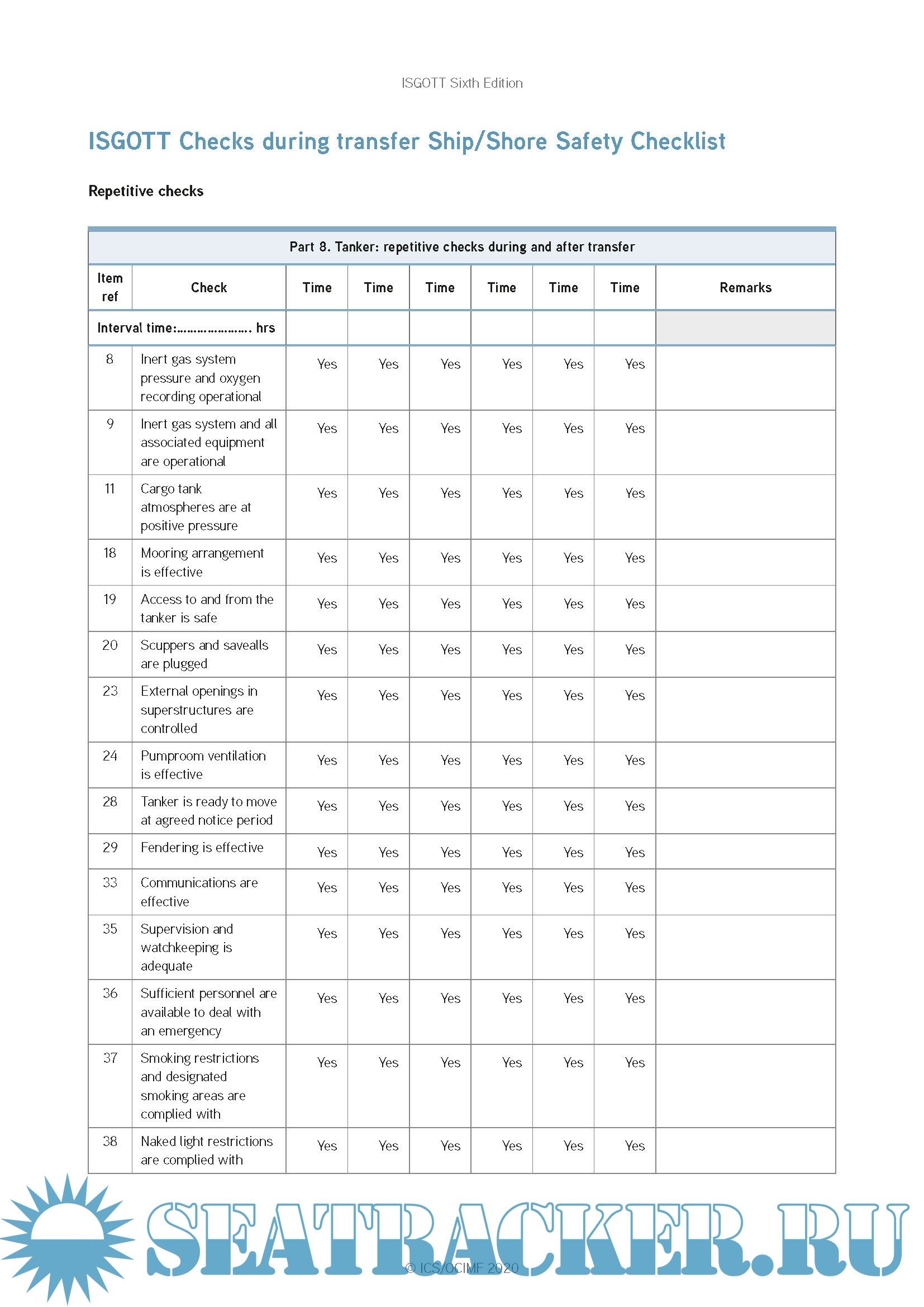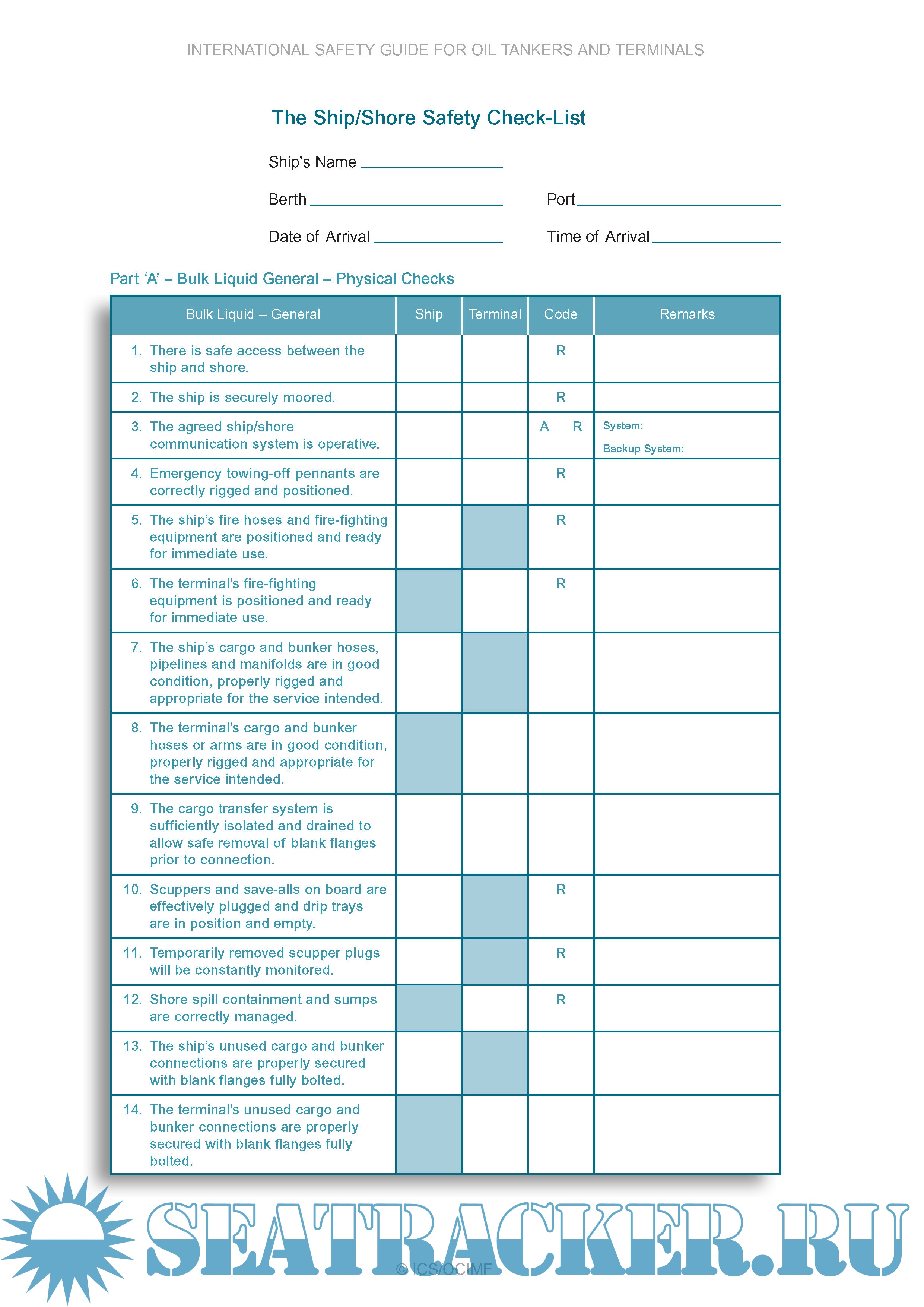 Year: 2020 Language: english Author: OCIMF & ICS Format: PDF Quality: eBook Pages count: Multiple Description: The Ship/Shore Safety and Bunkering Operations Checklists have been completely revised to reflect changes in the understanding of the impact of human factors in their effective use. The importance of ensuring that individual and joint responsibilities for the tanker and the terminal are clearly communicated before arrival, as well as when alongside, is central to this objective.
