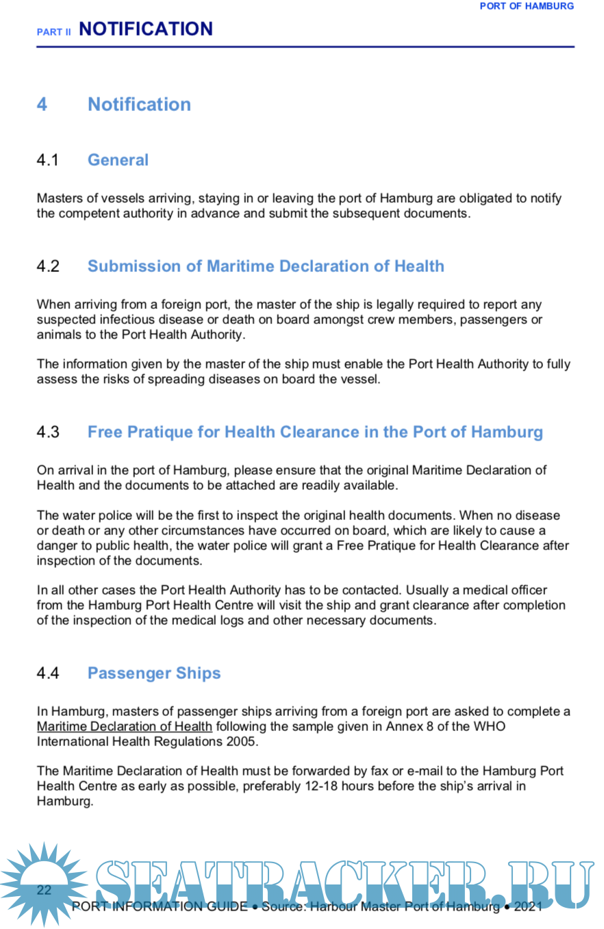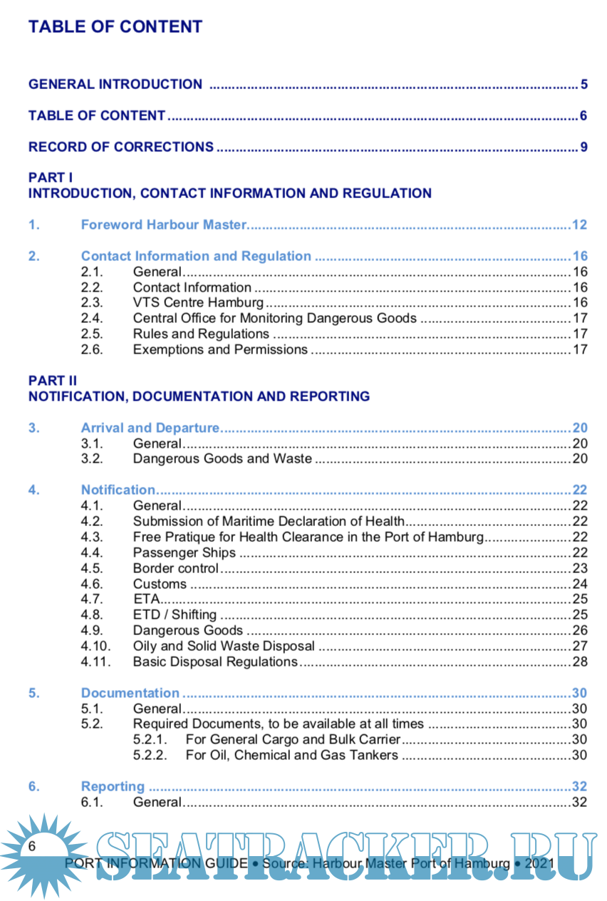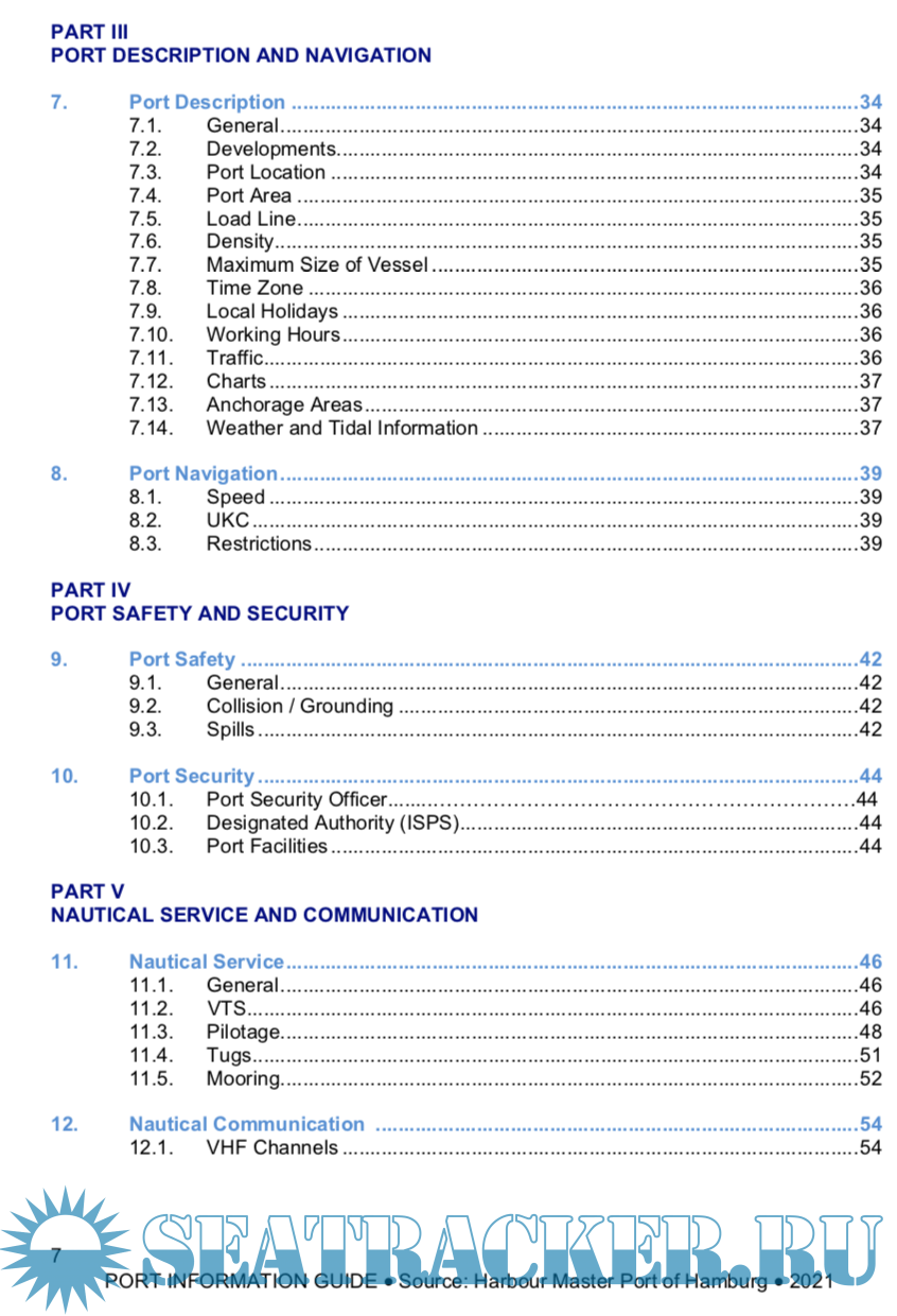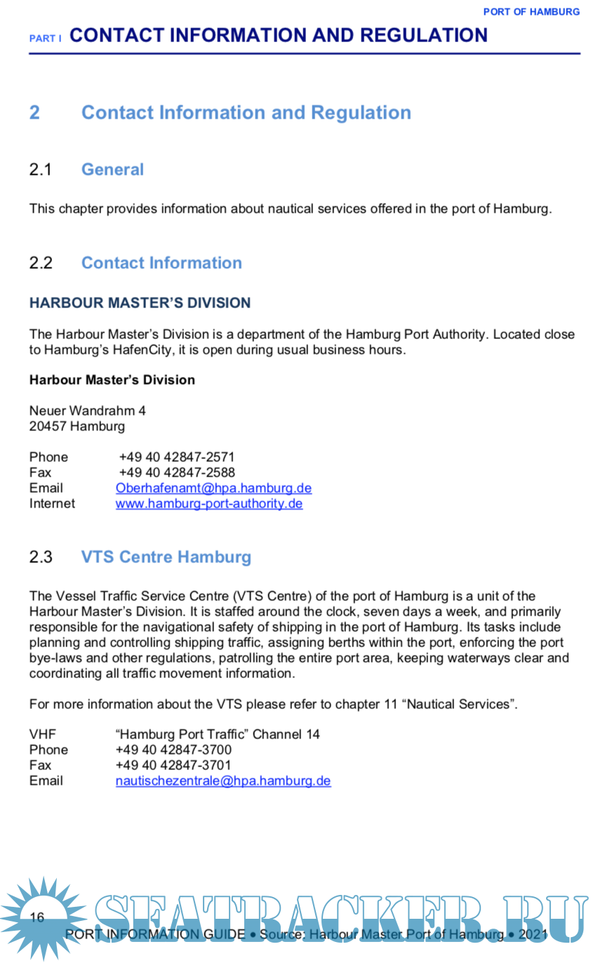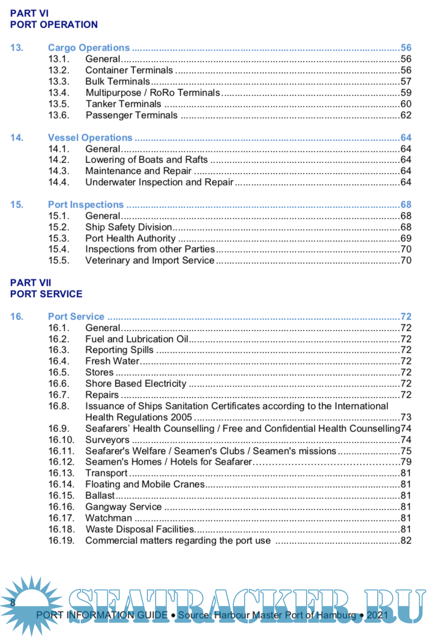 Year: 2021 Language: english Author: HPA Genre: Guide Publisher: HPA Format: PDF Quality: eBook Pages count: 82 Description: Welcome to the port of Hamburg! Stretching across an area of 87 sq. km, it is one of the largest ports in the world. Our principal responsibility is to ensure the safe passage of every ship both in the port of Hamburg and on its approach channels, and we continuously strive to improve our services. In collaboration with my staff at the Harbour Master’s Division of the Hamburg Port Authority and in co-operation with many other parties involved such as the pilots’ associations, the water police, the port-operating businesses and the Federal Waterways and Shipping Administration, I - as Hamburg’s Chief Harbour Master - make every effort to ensure that the master of every ship calling at the port of Hamburg enjoys his stay at the port, offering not only safe and secure port operations but also speedy cargo handling services. The growing globalisation of the world economy caused world trade and international transport volumes to rise, which in turn resulted in increasingly frequented navigable waterways, harbour entrances and port facilities. The port of Hamburg is extremely busy. Apart from seagoing vessels, inland waterway crafts, port ships, traditional ships and sport boats use its waters as well, which means that a multitude of different data collection, control and monitoring tasks must be performed around the clock to keep up with constantly changing traffic conditions. Ships come and go, load and discharge, take on supplies and shift. To ensure that traffic runs smoothly, all movements must be captured and monitored accurately. This is the responsibility of the Harbour Master’s Division of the Hamburg Port Authority.