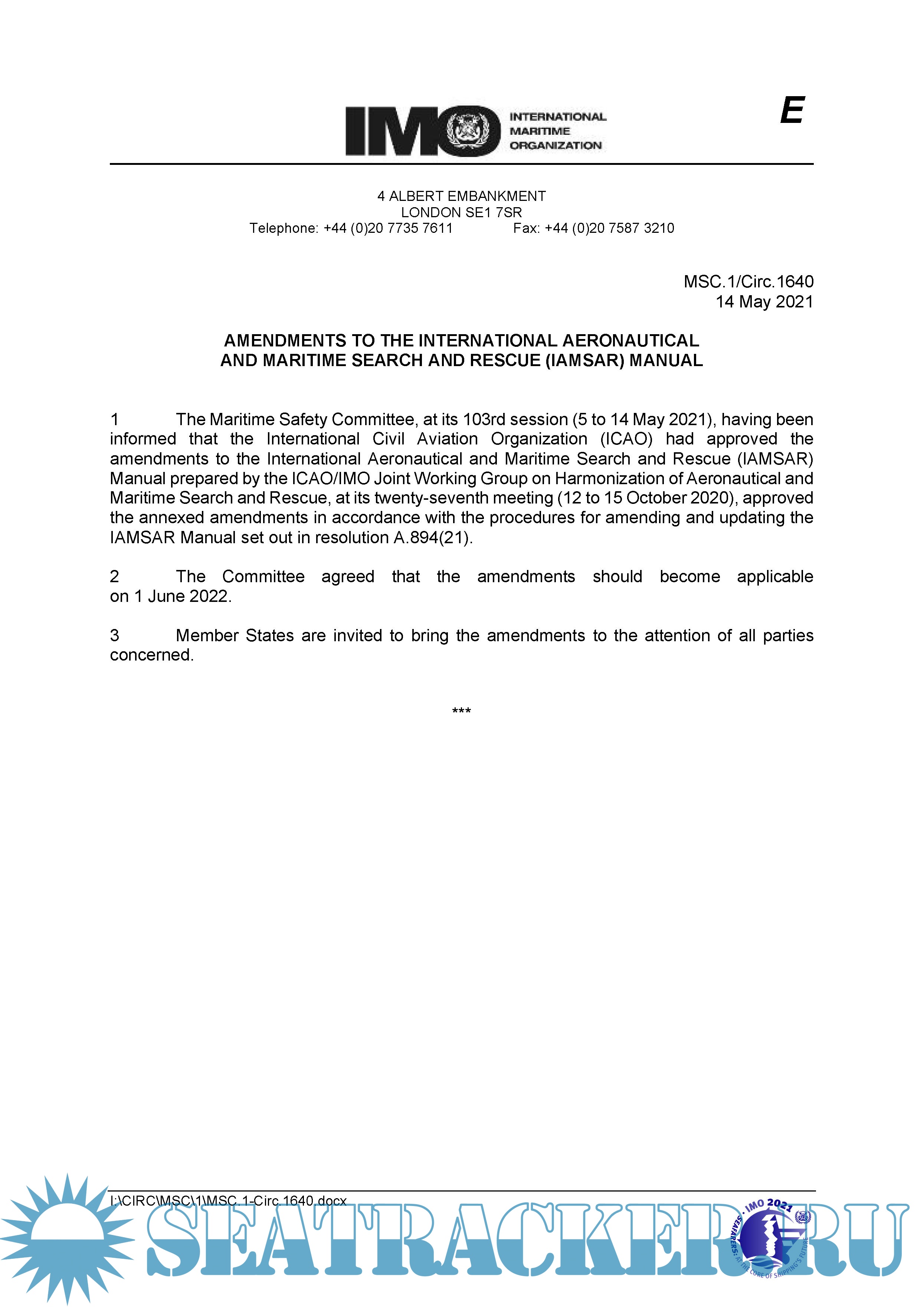 Description: The Maritime Safety Committee, at its 103rd session (5 to 14 May 2021), having been informed that the International Civil Aviation Organization (ICAO) had approved the amendments to the International Aeronautical and Maritime Search and Rescue (IAMSAR) Manual prepared by the ICAO/IMO Joint Working Group on Harmonization of Aeronautical and Maritime Search and Rescue, at its twenty-seventh meeting (12 to 15 October 2020), approved the annexed amendments in accordance with the procedures for amending and updating the IAMSAR Manual set out in resolution A.894(21). The Committee agreed that the amendments should become applicable on 1 June 2022. Member States are invited to bring the amendments to the attention of all parties concerned.