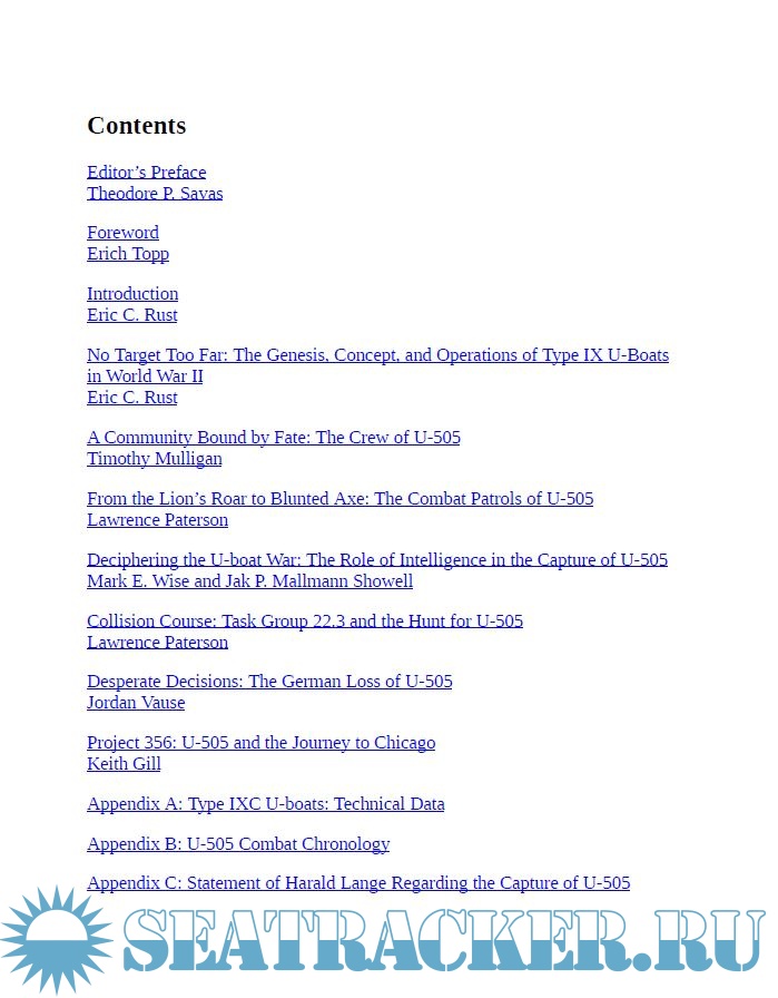 Year: 2006 Language: english Author: Edited by Theodore P.Savas Publisher: Savas Beatie LLC ISBN: 1-932714-01-4 Format: PDF Quality: OCR with errors Pages count: 351 Description: One of World War II’s pivotal events was the capture of U-505 on June 4, 1944. The top secret seizure of this massive Type IX submarine provided the Allies with priceless information on German technology and innovation. After the war U-505 was transported to Chicago, where today several hundred thousand visitors a year pass through its well-preserved hull at the Museum of Science and Industry. Hunt and Kill offers the first definitive study of U-505, with chapters on her construction, crew and commanders, combat history, an assessment of Type IX operations, naval intelligence, the eight fatal German mistakes that doomed the ill-fated boat, her capture, and final transportation and restoration for posterity. The contributors to this fascinating volume--a Who’s Who of U-boat historians--include: Erich Topp (U-552, Odyssey of a U-boat Commander); Eric Rust (Naval Officers Under Hitler); Timothy Mulligan (Neither Sharks Nor Wolves); Jak Mallmann Showell (Hitler’s U-boat Bases); Jordan Vause (Wolf); Lawrence Patterson (First U-boat Flotilla); Mark Wise (Enigma and the Battle of the Atlantic); Keith R. Gill (Curator, U-505, Museum of Science and Industry), and Theodore P. Savas (Nazi Millionaires). About the Author Theodore P. Savas is the author or editor of many books including A Guide to the Battles of the American Revolution and The New American Revolution Handbook (with J. David Dameron), Hunt and Kill: U-505 and the U-Boat War in the Atlantic, and Silent Hunters: German U-boat Commanders of World War II.