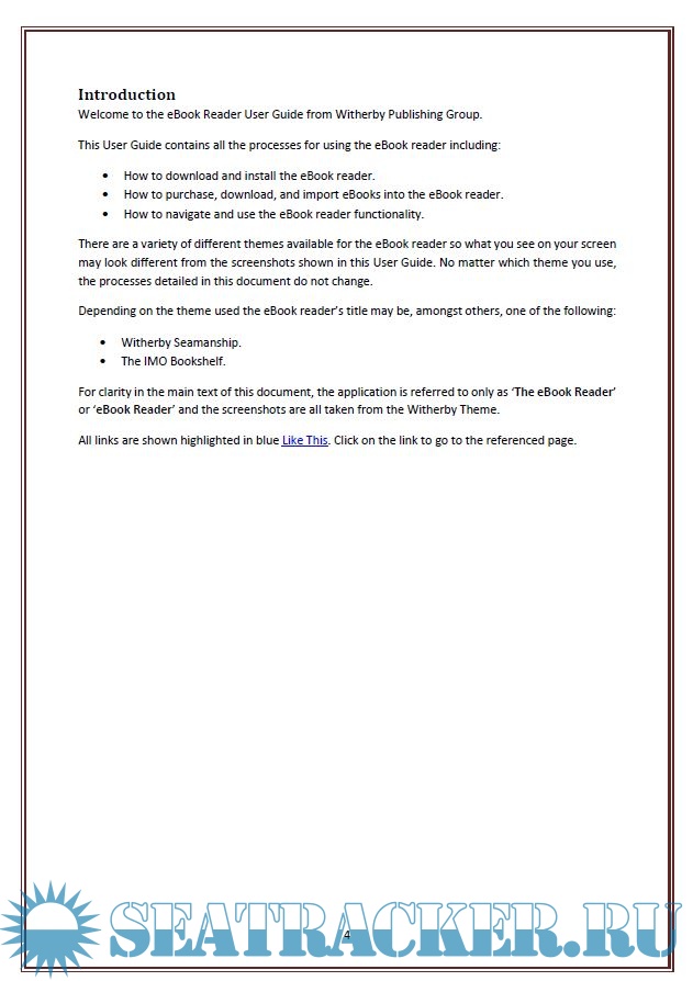 Year: 2019 Language: english Author: Witherbys Publisher: Witherby Publishing Group Ltd. Edition: v5.11 Format: PDF Quality: eBook Pages count: 103 Description: This User Guide contains all the processes for using the eBook reader including: • How to download and install the eBook reader. • How to purchase, download, and import eBooks into the eBook reader. • How to navigate and use the eBook reader functionality.