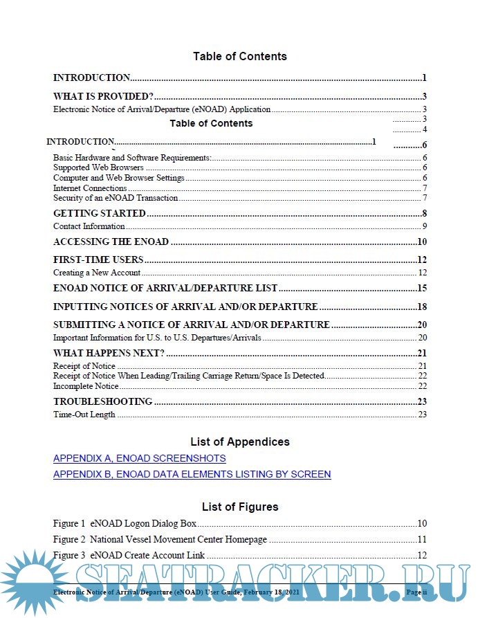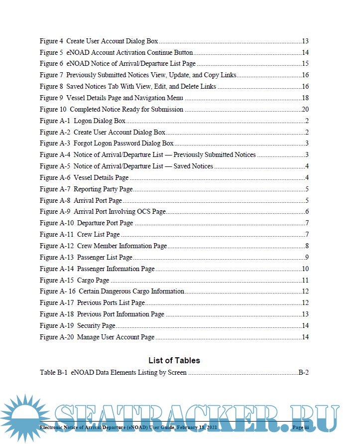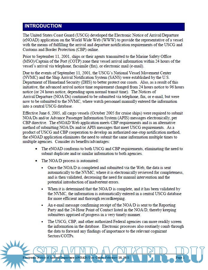 Year: 2021 Language: english Author: USCG Genre: Guide Publisher: United States Coast Gaurd Edition: Version 6.0 Format: PDF Quality: eBook Pages count: 48 Description: The United States Coast Guard (USCG) developed the Electronic Notice of Arrival/Departure (eNOAD) application on the World Wide Web (WWW) to provide the representative of a vessel with the means of fulfilling the arrival and departure notification requirements of the USCG and Customs and Border Protection (CBP) online.