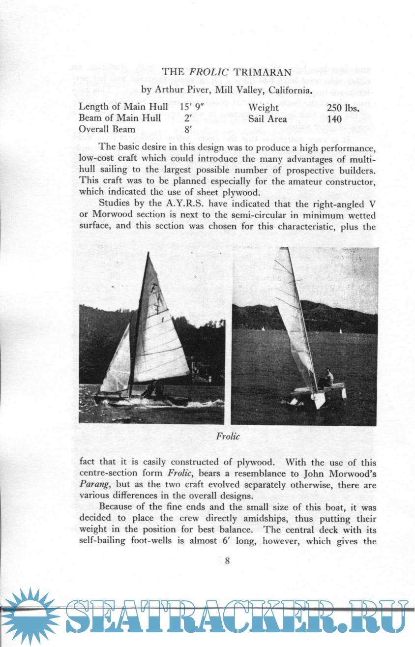 Year: 1959 Language: english Author: A.Y.R.S. Genre: Collection of books Publisher: A.Y.R.S. Format: PDF Quality: Scanned pages Pages count: 36 Description: The AYRS is a UK registered Educational Charity (No 234081) dedicated to finding out how to make yachting better (faster, more fun, whatever you want it to be). Our members run from sober sided professional yacht designers and builders to bearded eccentrics full of ideas that they cannot make work.From our members have come the modern sailing multihulls, self-steering gear, sailboards, a flock of successful sailing hydrofoils, the World Speed Sailing Record system, etc. Now people are taking off with kiteboats and autogyro-sails, and the first amphibious bicycle.