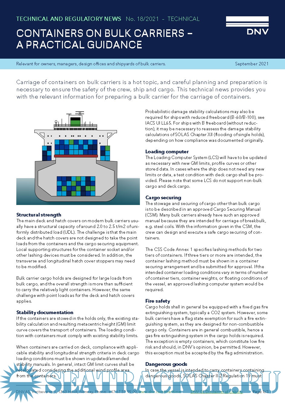 Year: 2021 Language: english Author: DNV Genre: Guide Format: PDF Quality: eBook Pages count: >0 Description: Carriage of containers on bulk carriers is a hot topic, and careful planning and preparation is necessary to ensure the safety of the crew, ship and cargo. This technical news provides you with the relevant information for preparing a bulk carrier for the carriage of containers. Published: 30 September 2021