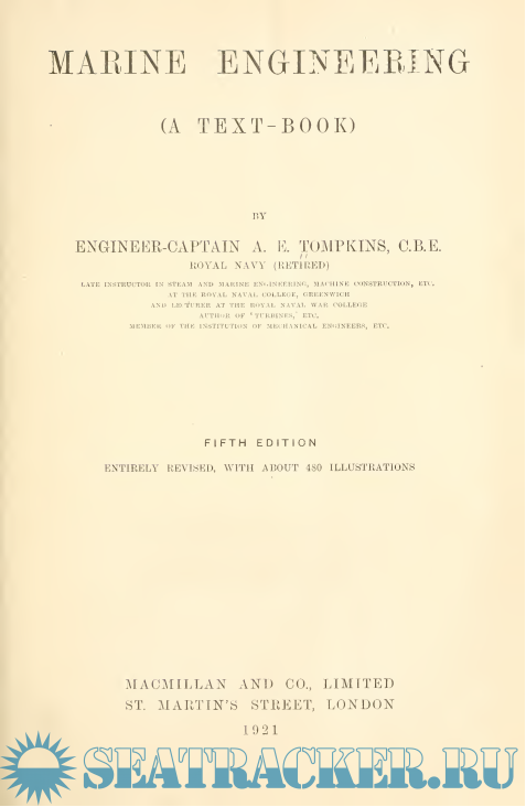 Year: 1920 Language: english Author: A. E. Tompkins Genre: Textbook Publisher: Macmillan Co. Format: PDF Quality: Scanned pages Pages count: 890 Description: This is a completely re-written, updated and revised release of the textbook which, together with a huge number of newly added illustrations and images, forms an excellent guide to the construction and operating principles of the machinery installed on board marine vessels, i.e. diesel engines and boilers. This edition of the textbook contains more chapter in comparison to the previous edition. Moreover, there is now a separate introductory section developed to address the syllabus that is usually used during the naval training. Some little portion of the publication has been given to the types of marine boilers and engines that are now considered obsolete. In addition, the auxiliary section of the book covers such the important matters of marine engineering as steering gear, towing arrangement and other deck equipment, electrical machinery and associated equipment, air compressors, various hydraulic machinery, refrigerators, etc. Particular attention has been paid to such important aspects of naval architecture and ship construction as water-tightness of the hull, ship stability, pumping arrangement, fire-fighting matters etc. Finally, the last section of the book addresses the steam turbines and ICE, i.e. internal combustion engines. The author did his best to explain the complex technical matters in a very simple and understandable manner.