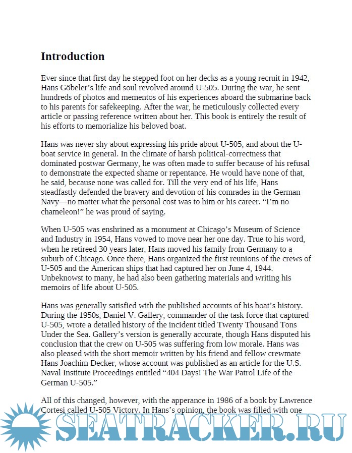 Year: 2008 Language: english Author: Hans Jacob Goebeler ISBN: 978-1-61121-007-1 Format: PDF Quality: eBook Pages count: 276 Description: Hans Goebeler is known as the man who “pulled the plug” on U-505 in 1944 to keep his beloved U-boat out of Allied hands. 'Steel Boat, Iron Hearts' is his no-holds-barred account of service aboard a combat U-boat. It is the only full-length memoir of its kind, and Goebeler was aboard for every one of U-505’s war patrols. Using his own experiences, log books, and correspondence with other U-boat crewmen, Goebeler offers rich and very personal details about what life was like in the German Navy under Hitler. Because his first and last posting was to U-505, Goebeler’s perspective of the crew, commanders, and war patrols paints a vivid and complete portrait unlike any other to come out of the Kriegsmarine. He witnessed it all: from deadly sabotage efforts that almost sunk the boat to the tragic suicide of the only U-boat commander who took his life during WWII; from the terror and exhilaration of hunting the enemy, to the seedy brothels of France. The vivid, honest, and smooth-flowing prose calls it like it was and pulls no punches. U-505 was captured by Captain Dan Gallery’s Guadalcanal Task Group 22.3 on June 4, 1944. Trapped by this “Hunter-Killer” group, U-505 was depth-charged to the surface, strafed by machine gun fire, and boarded. It was the first ship captured at sea since the War of 1812! Today, hundreds of thousands of visitors tour U-505 each year at the Chicago Museum of Science and Industry. Included a special Introduction by Keith Gill, Curator of U-505, Museum of Science and Industry. Author Hans Jacob Goebeler served as control room mate aboard U-505. He died in 1999, and author John P. Vanzo is a former defense program analyst. He teaches political science and geography at Bainbridge College in Georgia.
