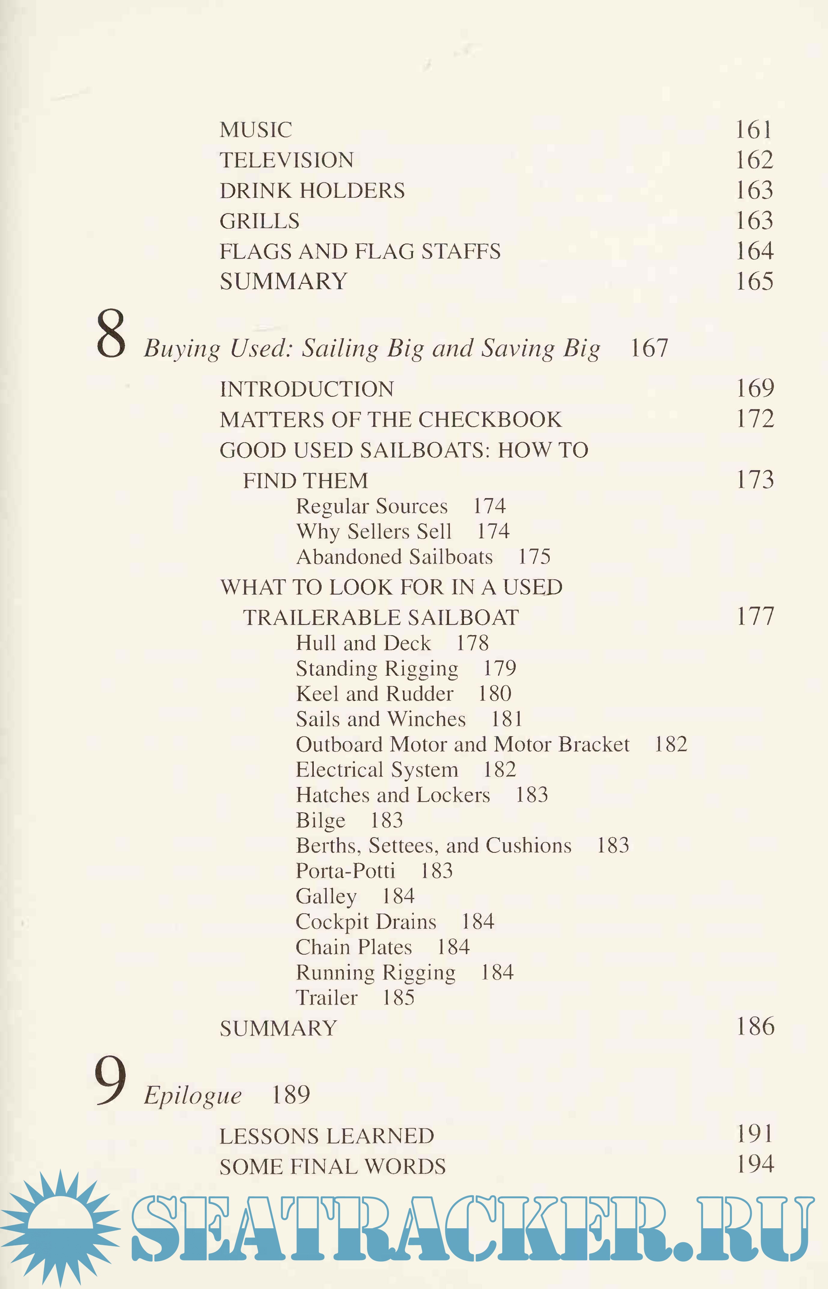 The author of this book has the easy job of convincing you that a small sailboat is cheap and easy to maintain, especially if you can live with a secondhand boat. This book is a well-detailed training manual for boat buying...This book also contains a list of first-aid needs, a list of tool-kit needs, and instructions on caring for your trailer. (The Ensign)