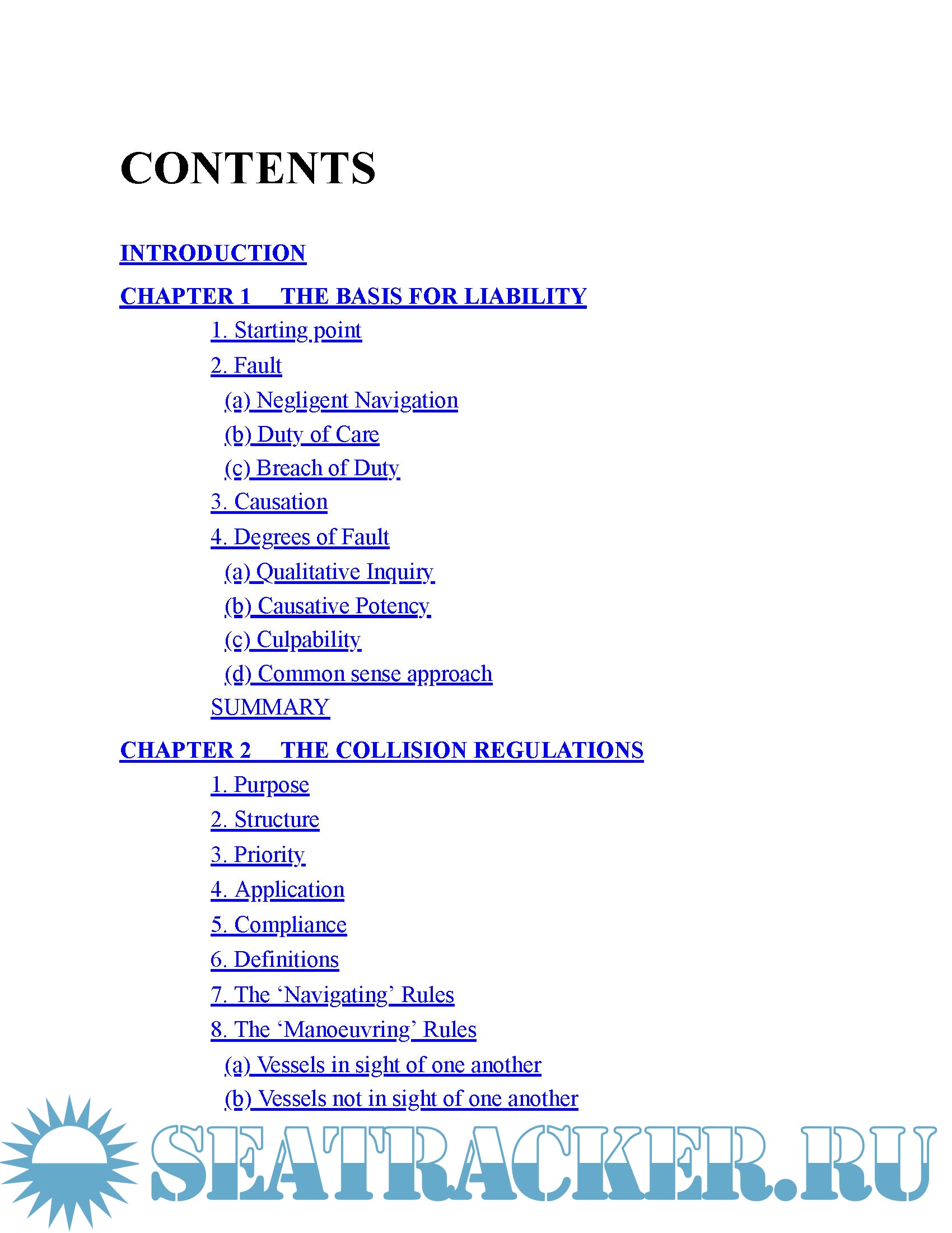It has been over forty years now since the present International Regulations for Preventing Collisions at Sea -the Collision Regulations- came into force. It’s been over forty years in which there have been considerable technological improvements in ship design and equipment. Despite these improvements, however, mariners are still having collisions; and marine lawyers are still being called upon to settle liability for these collisions. Understanding how the courts interpret the Collision Regulations and apportion liability, therefore, will benefit both the mariner and the marine lawyer and all those involved in teaching the rules and investigating the causes of collisions at sea. This book is for you.