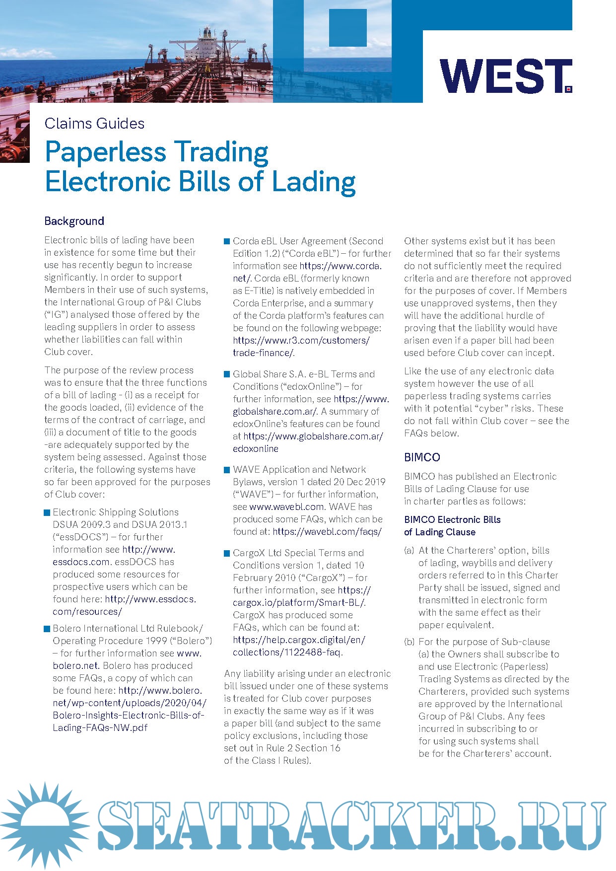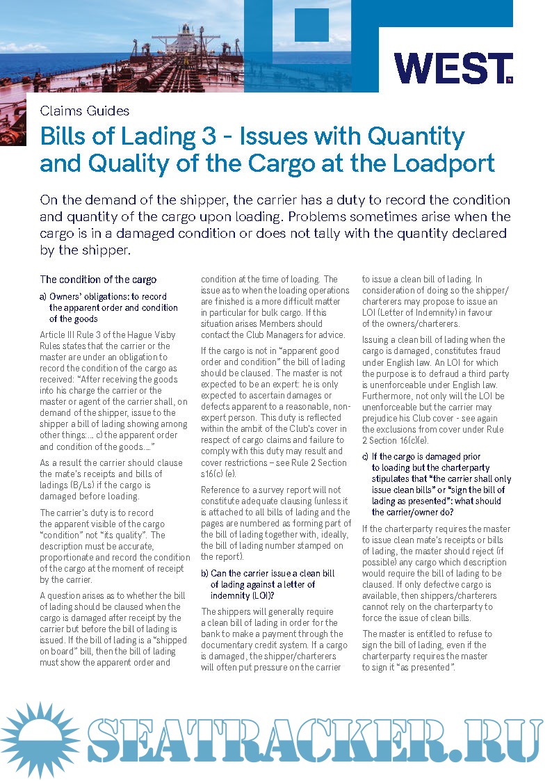Year: 2021 Language: english Author: West of England P&I Club Format: PDF+MP4 Quality: eBook Pages count: Multiple Description: West has assembled a library of resources dedicated to helping with matters involving Bills of Lading, including videos, claims guides and articles covering a wide variety of topics. Watch our helpful introductory video by Claims Director, Fiona McCoig and Claims Manager, Christina Anderson in which they discus the three functions of a Bill of Lading and common issues which can arise from the perspective of the contractual carrier. The use of electronic Bills of Lading is becoming increasingly common in many shipping trades and the number of system providers continues to grow. West has produced guides and other information to help guide Members in this area.