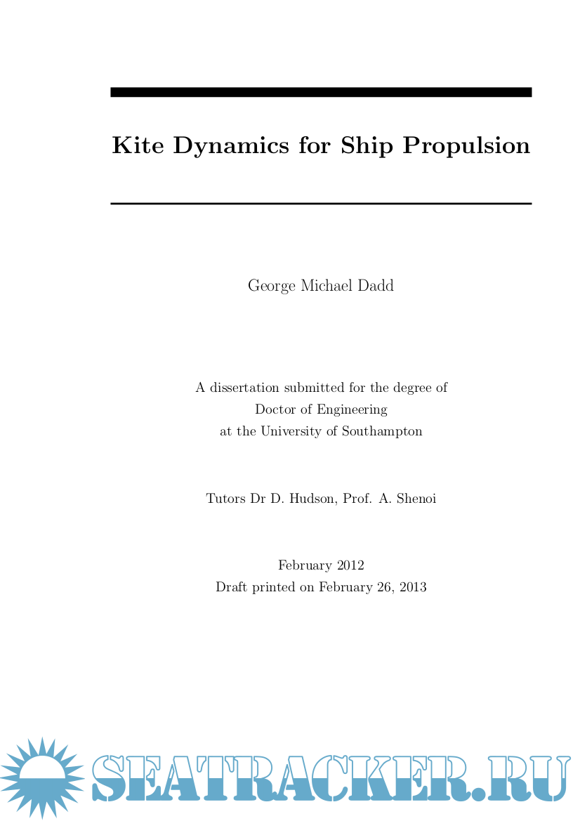 Year: 2012 Language: english Author: G. M. Dadd Genre: Research papers Publisher: University of Southampton Format: PDF Quality: eBook Pages count: 215 Description: Kite propulsion has emerged as an attractive means to harness wind power in a way that yields environmental and financial benefits. An understanding of the dynamics that affect kite motion and the resulting forces is required to facilitate the design and optimization of kite propulsion systems. In this thesis results from two line tension models are compared with experimentally recorded time histories for dynamic kite flight. New methodologies for investigating kite performance are established. The first zero mass model assumes that the kite and lines are weightless. The second, lumped mass model, considers the kites mass and thus makes use of the equations of motion. It is found that the two different models converge to the same result in the limit where the kite mass tends to zero. The zero mass model has been shown to compare favourably with experimental results. A method for parameterising figure of eight shape kite trajectories and for predicting kite velocity is presented. Results are shown for a variety of manoeuvre shapes, assuming realistic performance characteristics from an experimental test kite. Using a 320m 2 kite, with 300m long flying lines in 6.18ms −1 wind, a time averaged propulsive force of 16.7 tons is achievable. A typical kite force polar is presented and a new sensitivity study is carried out to identify the importance of various parameters in the system. Small horizontally orientated figure of eights shape kite trajectories centred on an elevation of 15 ◦ are preferred for maximising propulsive benefit. Force is found to be highly sensitive to aspect ratio. Increasing aspect ratio from 4 to 5 is estimated to yield up to 15% more drive force.