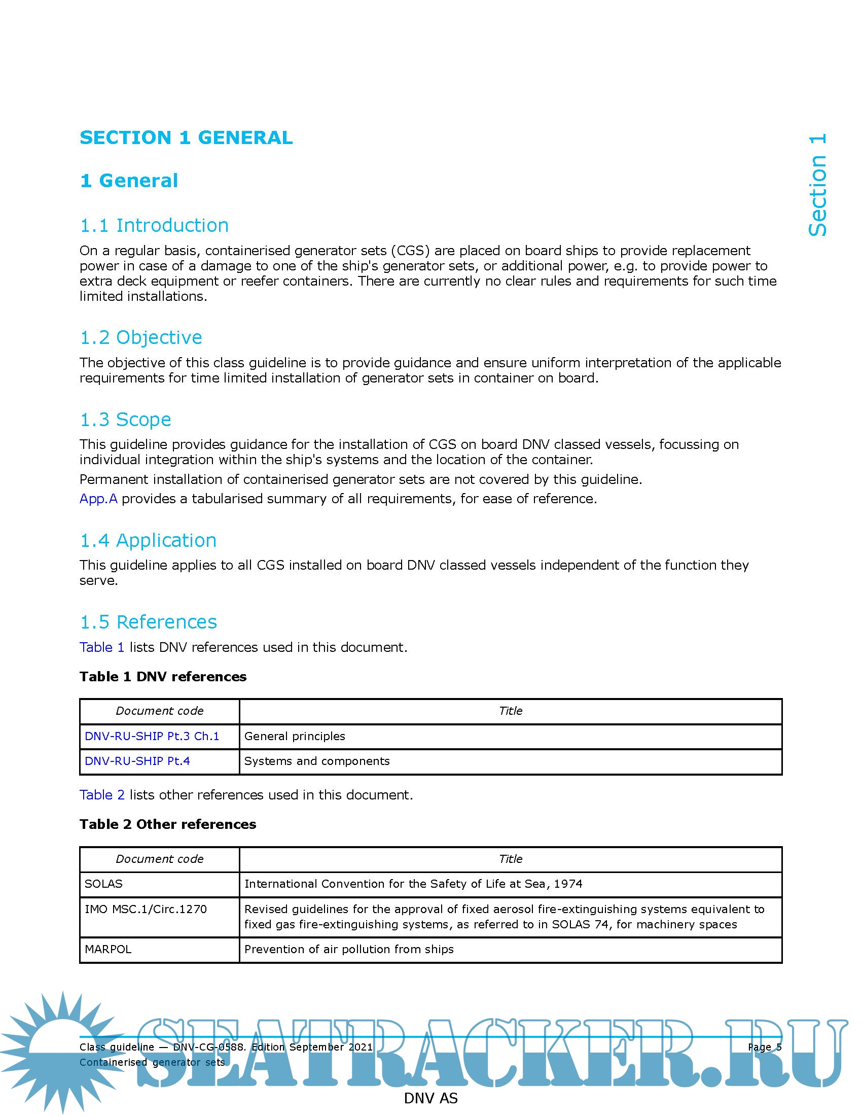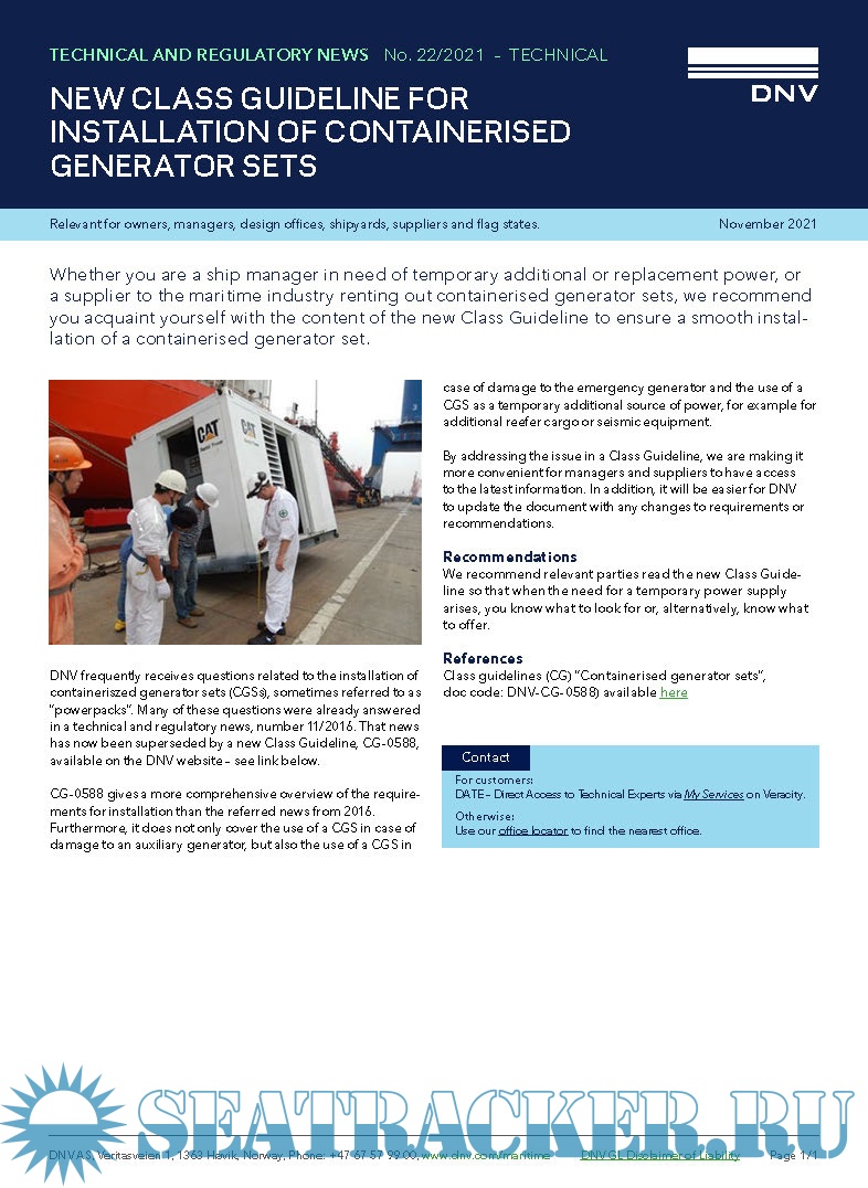 Year: 2021 Language: english Author: DNV Genre: Guide Format: PDF Quality: eBook Pages count: 17+1 Description: Whether you are a ship manager in need of temporary additional or replacement power, or a supplier to the maritime industry renting out containerised generator sets, we recommend you acquaint yourself with the content of the new Class Guideline to ensure a smooth installation of a containerised generator set. This Class Guideline gives a more comprehensive overview of the requirements for installation than the referred news from 2016. Furthermore, it does not only cover the use of a CGS in case of damage to an auxiliary generator, but also the use of a CGS in case of damage to the emergency generator and the use of a CGS as a temporary additional source of power, for example for additional reefer cargo or seismic equipment.