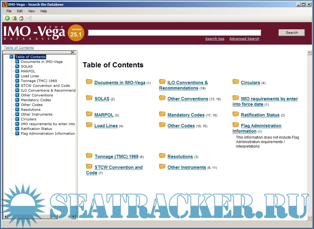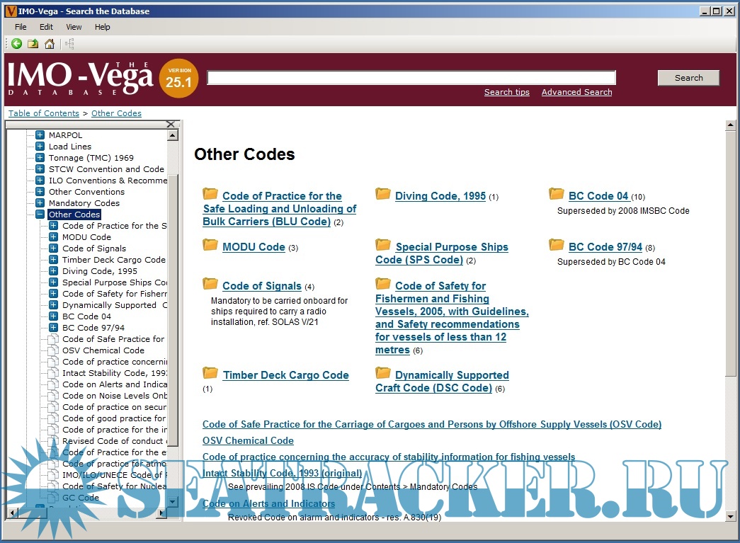 IMO-Vega is a searchable database of the regulation text of the SOLAS, MARPOL, Load Line conventions and other conventions,and codes such as ISM, ISPS, 2000 HSC Code, IBC Code, and much much more.