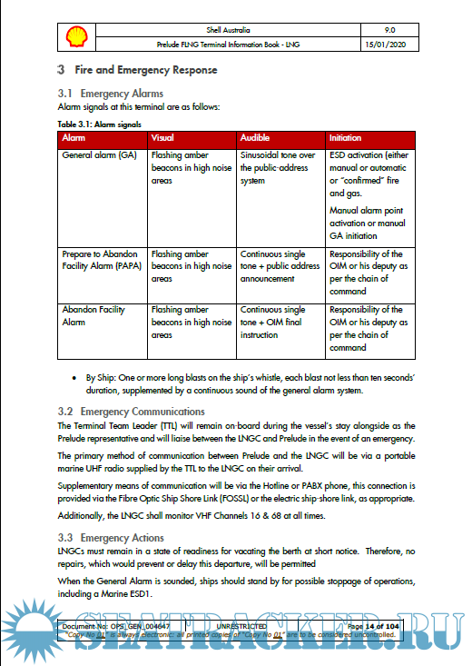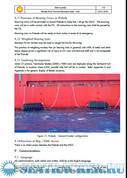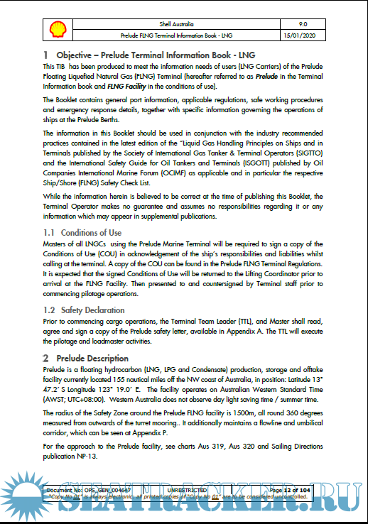 Description: This TIB has been produced to meet the information needs of users (LNG Carriers) of the Prelude Floating Liquefied Natural Gas (FLNG) Terminal (hereafter referred to as Prelude in the Terminal Information book and FLNG Facility in the conditions of use). The Booklet contains general port information, applicable regulations, safe working procedures and emergency response details, together with specific information governing the operations of ships at the Prelude Berths.
