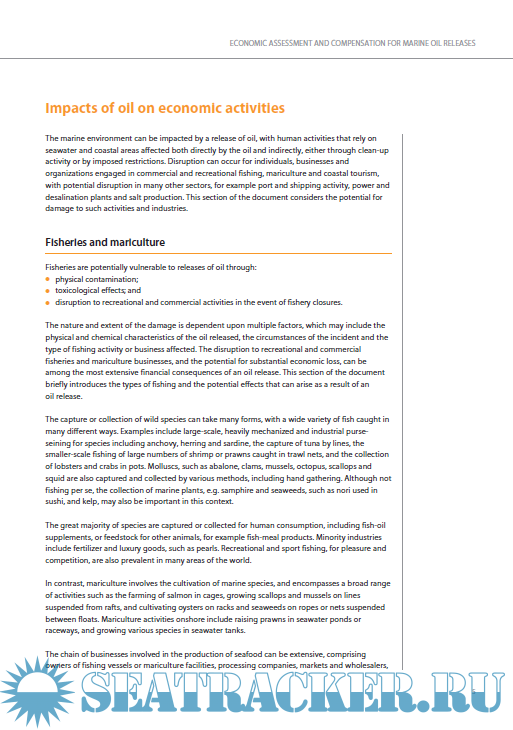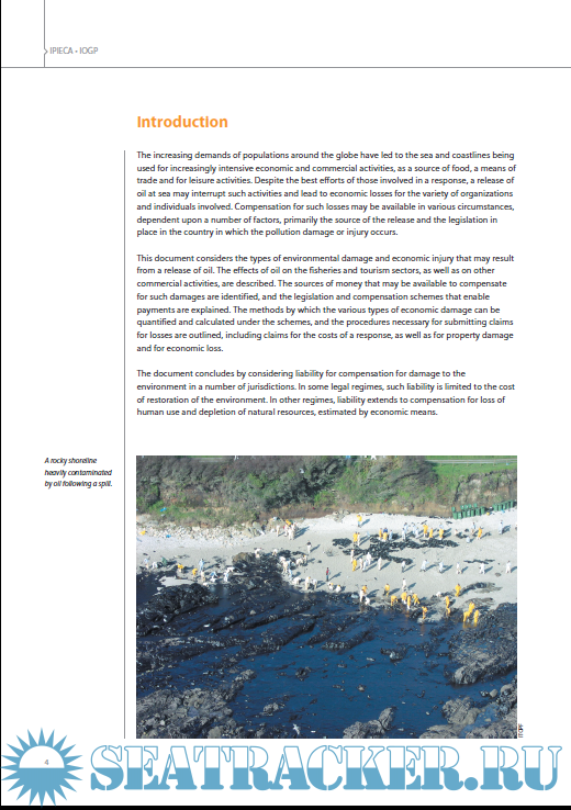 Year: 2015 Language: english Author: IPIECA - IOGP Genre: Guide Format: PDF Quality: eBook Pages count: 60 Description: The increasing demands of populations around the globe have led to the sea and coastlines being used for increasingly intensive economic and commercial activities, as a source of food, a means of trade and for leisure activities. Despite the best efforts of those involved in a response, a release of oil at sea may interrupt such activities and lead to economic losses for the variety of organizations and individuals involved. Compensation for such losses may be available in various circumstances, dependent upon a number of factors, primarily the source of the release and the legislation in place in the country in which the pollution damage or injury occurs.