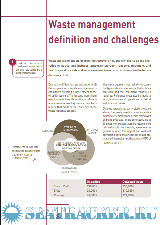 Description: Waste management starts from the removal of oil and oily debris on the shoreline or at sea, and includes temporary storage, transport, treatment, and final disposal in a safe and secure manner taking into consideration the hazardousness of oil. Due to the difficulties associated with all these operations, waste management is considered as being a key element of the oil spill response. The lessons learnt from past incidents have shown that a failure in waste management logistics can be a bottleneck that hinders the efficiency of the whole response process.
