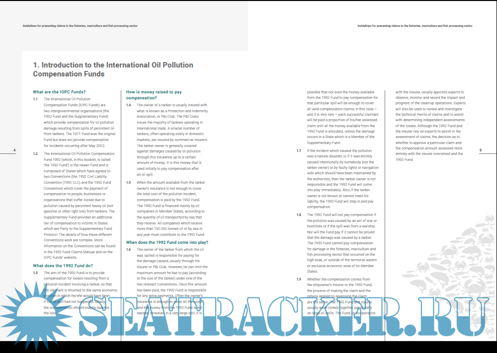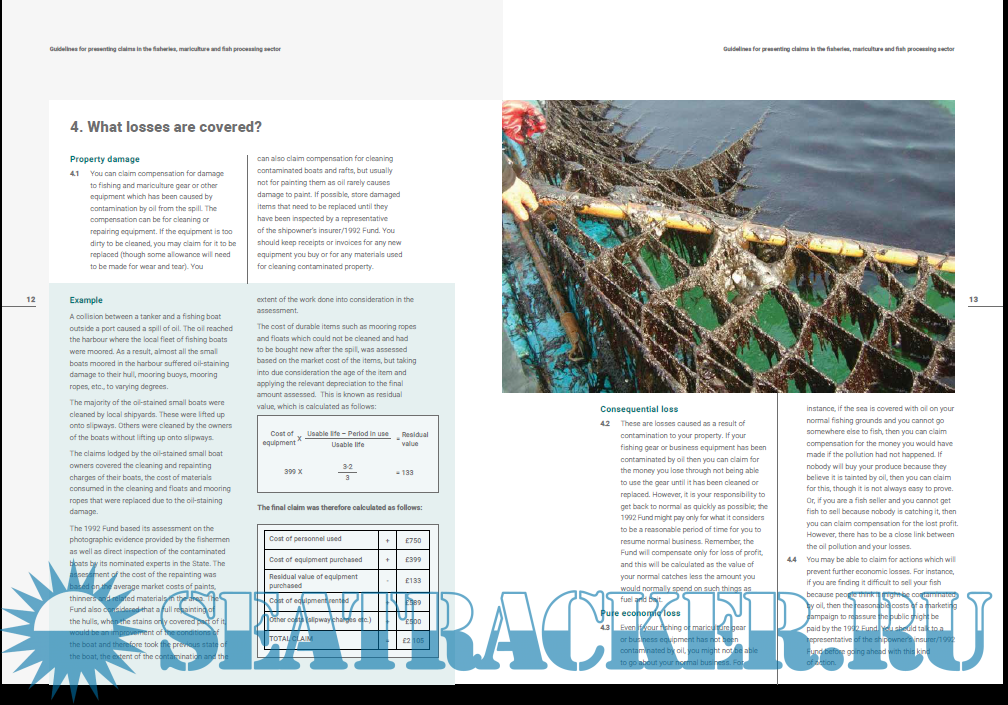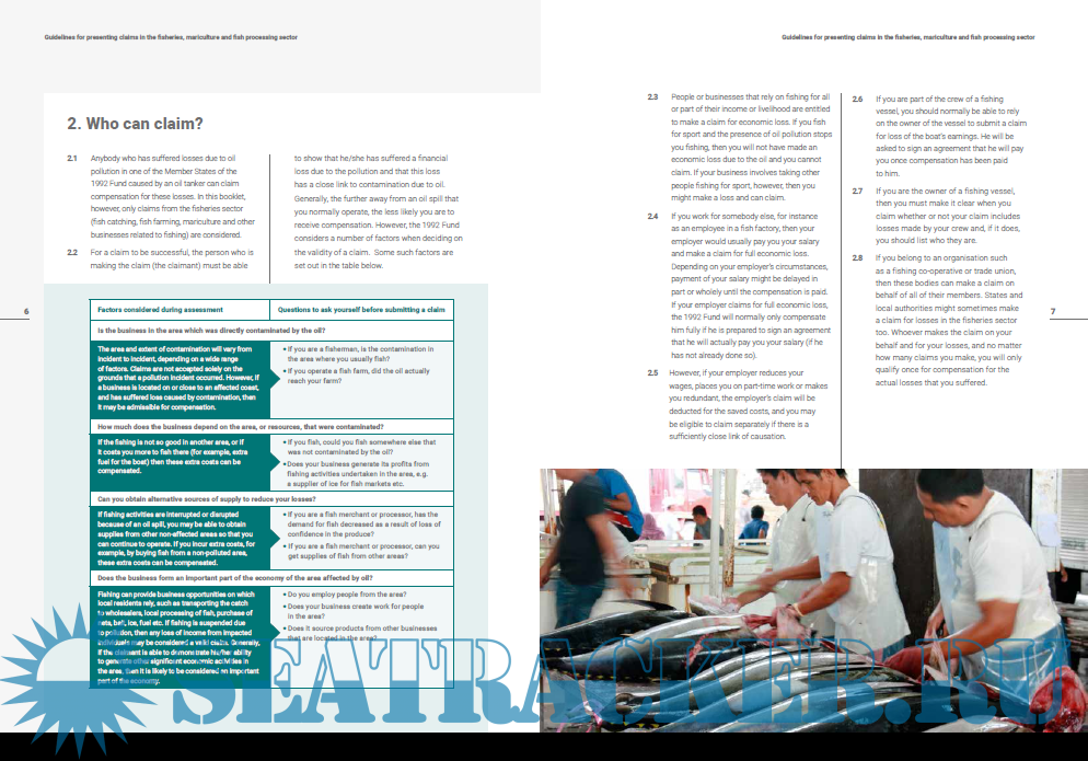 Description: Anybody who has suffered losses due to oil pollution in one of the Member States of the 1992 Fund caused by an oil tanker can claim compensation for these losses. In this booklet, however, only claims from the fisheries sector (fish catching, fish farming, mariculture and other businesses related to fishing) are considered