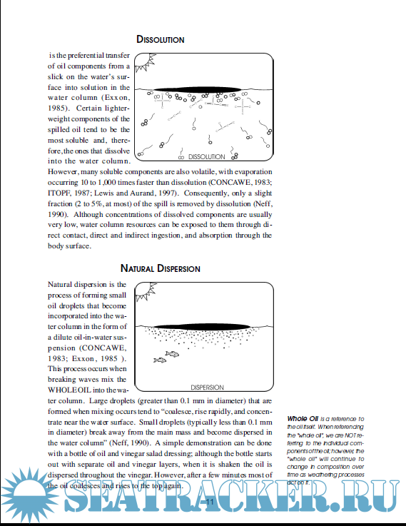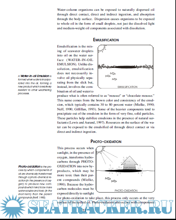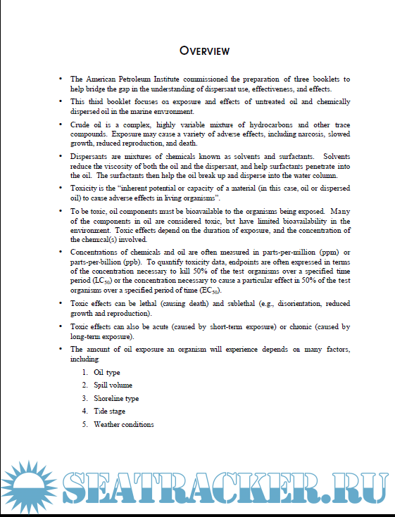 Year: 2001 Language: english Author: API Genre: Guide Format: PDF Quality: eBook Pages count: 63 Description: The American Petroleum Institute commissioned the preparation of three booklets to help bridge the gap in the understanding of dispersant use, effectiveness, and effects. This third booklet focuses on exposure and effects of untreated oil and chemically dispersed oil in the marine environment. Crude oil is a complex, highly variable mixture of hydrocarbons and other trace compounds. Exposure may cause a variety of adverse effects, including narcosis, slowed growth, reduced reproduction, and death. Dispersants are mixtures of chemicals known as solvents and surfactants. Solvents reduce the viscosity of both the oil and the dispersant, and help surfactants penetrate into the oil. The surfactants then help the oil break up and disperse into the water column.