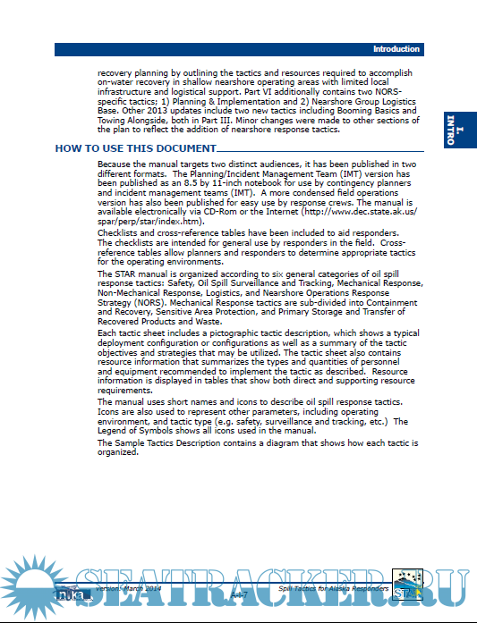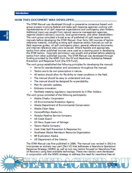 Year: 2014 Language: english Author: STAR Genre: Manual Format: PDF Quality: eBook Pages count: 274 Description: The Spill Tactics for Alaska Responders (STAR) manual provides a standardized oil spill response tactics manual specific to the State of Alaska. The manual is intended to be a standard tactical reference for oil spill planning and response activities in Alaska. It is available for use by the spill response community, including federal, state, local, industry, and spill response organizations throughout Alaska.