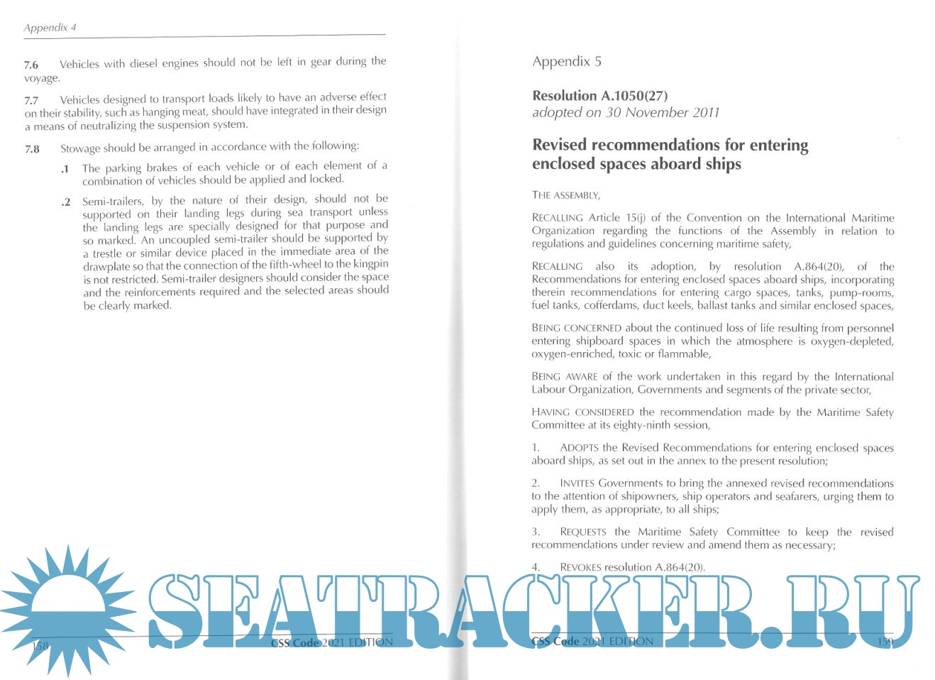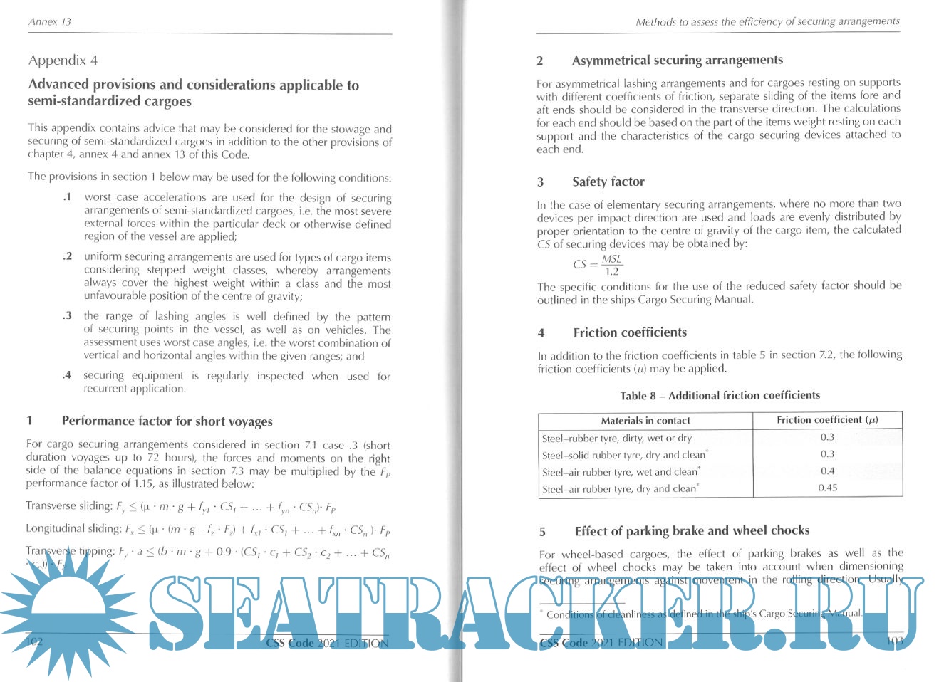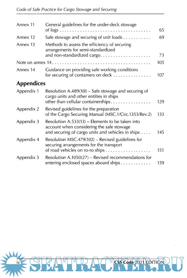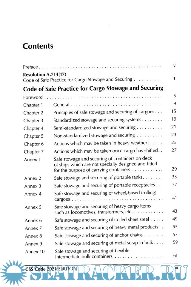 Description: The Code of Safe Practice for Cargo Stowage and Securing (CSS Code) provides an international standard for the safe stowage and securing of cargoes to promote the safety of life both at sea, and during loading and discharge. The 2021 edition incorporates all amendments up to and including 2020. In particular, this edition includes amendments to annex 13 on Methods to assess the efficiency of securing arrangements for semi-standardized and non-standardized cargo (MSC.1/Circ.1623), appendix 2 on Revised guidelines for the preparation of the Cargo Securing Manual (MSC.1/Circ.1353/Rev.2) and appendix 4 on Revised guidelines for securing arrangements for the transport of road vehicles on ro-ro ships (MSC.479(102)), which supersedes resolution A.581(14), as amended.