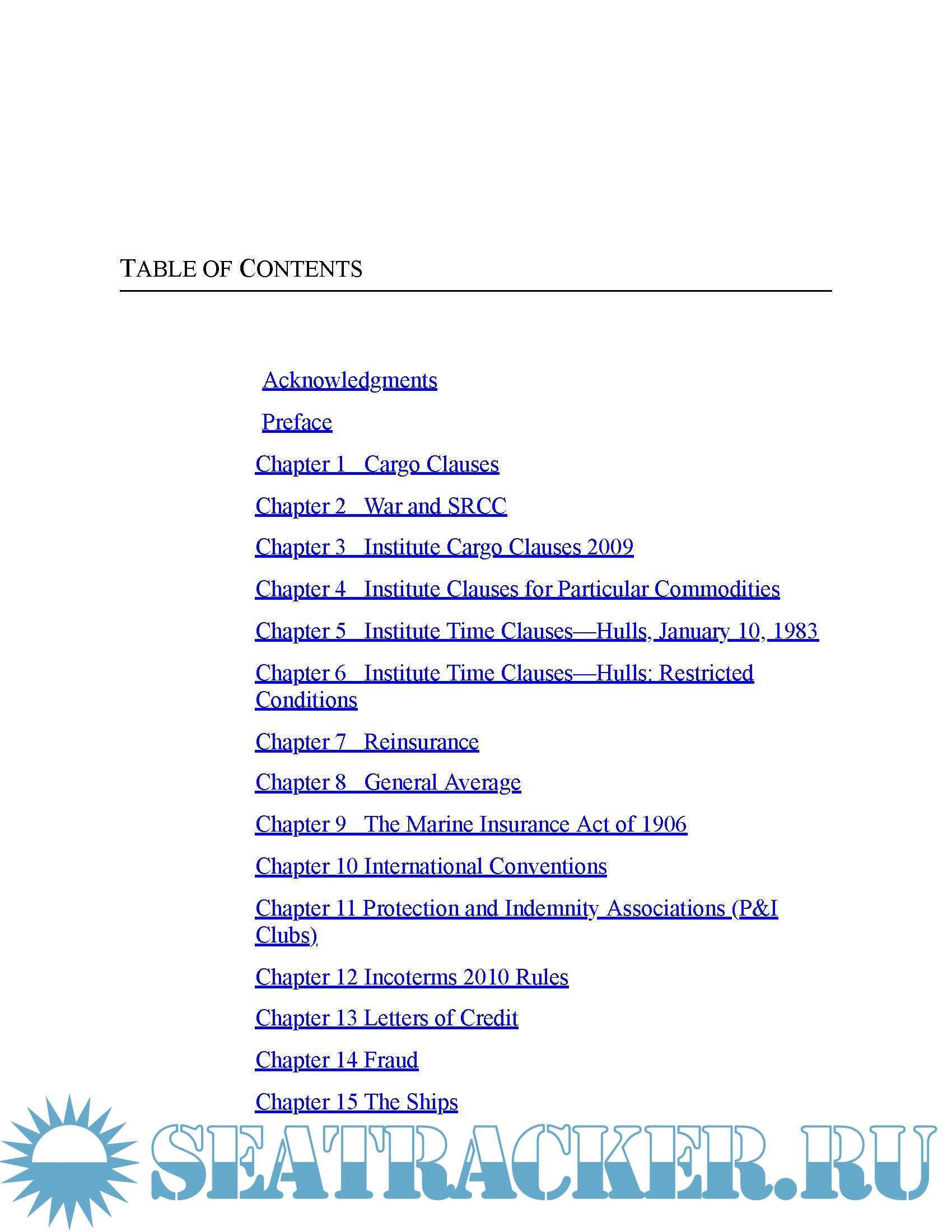 Year: 2016 Language: english Author: Bahaeddin Saffarin Genre: Handbook Publisher: CreateSpace Independent Edition: 1st edition (December 14, 2016) ISBN: 9781533497338 Format: EPUB/PDF Quality: eBook Pages count: 250 Description: The Marine Insurance Handbook: An Exploration and In-Depth Study of Marine Insurance Law and Clauses! How well versed are you in marine insurance? It may not be a field of study you think about very often, but it is crucial for anyone in the shipping industry. Marine insurance law may seem complicated, but it can be understood with a simple introduction to the basic concepts. Marine insurance expert Bahaeddin Saffarini provides exactly that in his new book, The Marine Insurance Handbook. He covers English maritime law and the many articles and clauses that relate to marine insurance. Saffarini includes everything a marine underwriter or claims manager needs to know to do his or her job. Saffarini focuses on cargo and hull insurances, as well as information about reinsurance practices and marine loss adjustment. Saffarini outlines the articles of the Marine Insurance Act 1906, which he calls the bible of marine insurance. He brings insurance law into the modern day with a comparison of the 1982 and 2009 cargo clauses. He also includes information about fraud, letters of credit, and protection and indemnity clubs. Marine insurance can be confusing owing to the many different types of vessels and commodities involved, but Saffarini makes it easy to understand by condensing all the information into this simple guide. :
