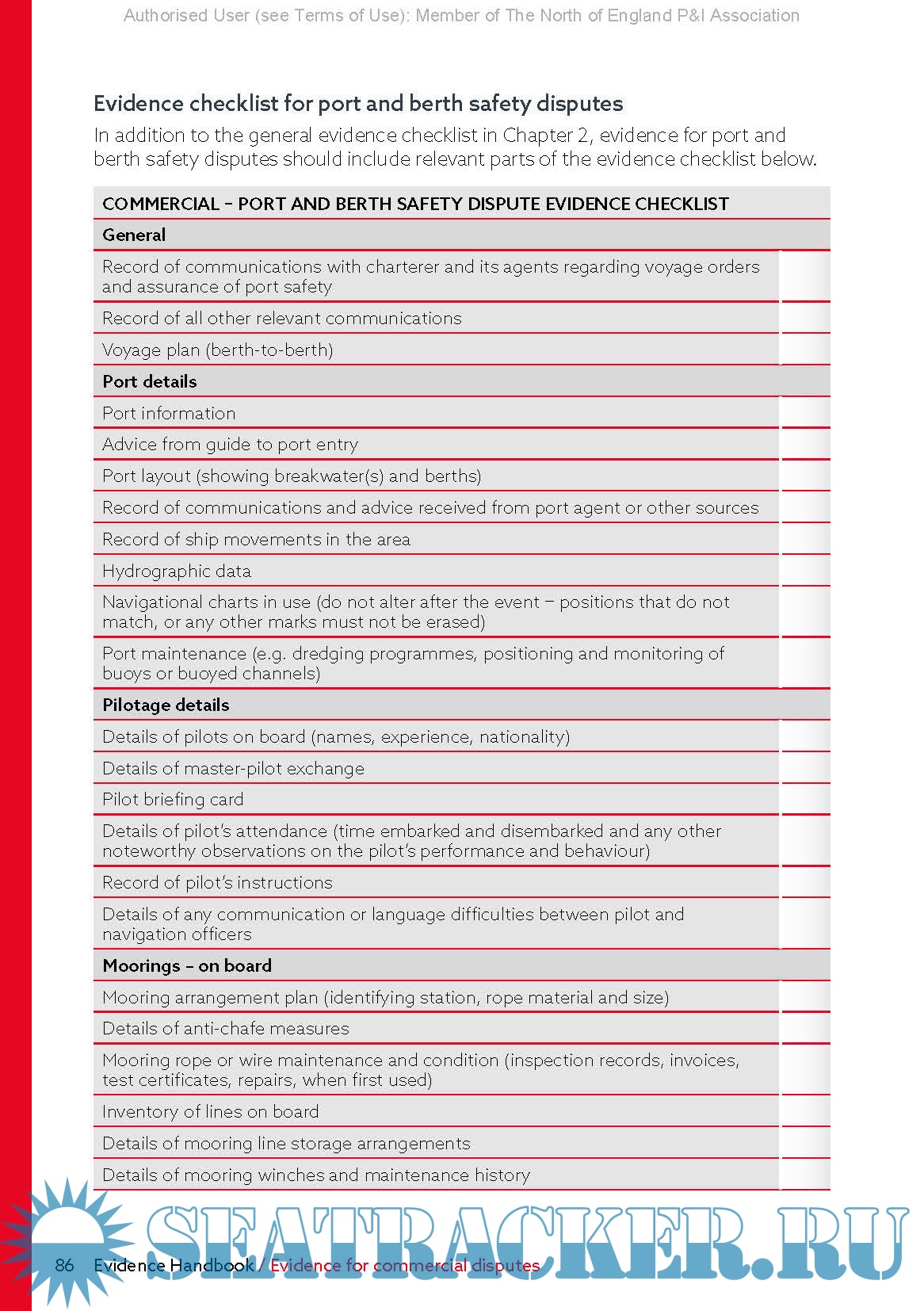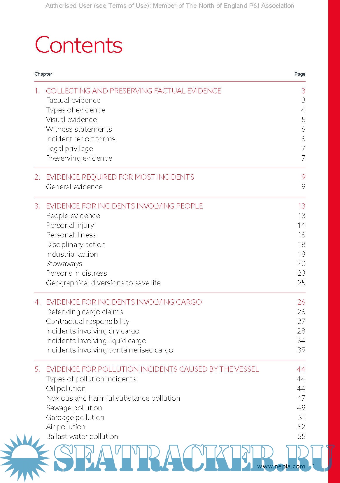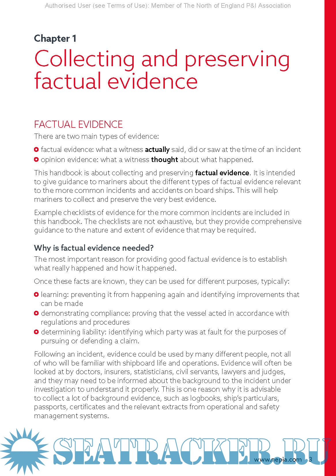 Year: 2021 Language: english Author: North P&I Club Genre: Handbook Publisher: North P&I Club Edition: 2nd edition August 2021 ISBN: 9780995565357 Format: PDF Quality: eBook Pages count: 99 Description: This publication guides mariners on collecting, preserving and reporting on various types of factual evidence relevant to incidents and accidents on board ship. All evidence types are contextualised through incidents involving people, cargo, hull and machinery, commercial disputes, pollution and the ship itself. Chapters are supplemented by procedural checklists relevant to the evidence required. This publication equips readers with the knowledge necessary to demonstrate a ship’s compliance, improve shipboard operations and determine liability when pursuing or defending a claim. Evidence checklists cover areas such as personal illness and performance warranty disputes, meaning crew are prepared for various eventualities. Detail is given on digital evidence types, explaining the practical use of electronic devices such as ECDIS and mobile phones. The publication guides readers on good reporting practice and time management, so that all evidence can be handled sensitively and without delay.
