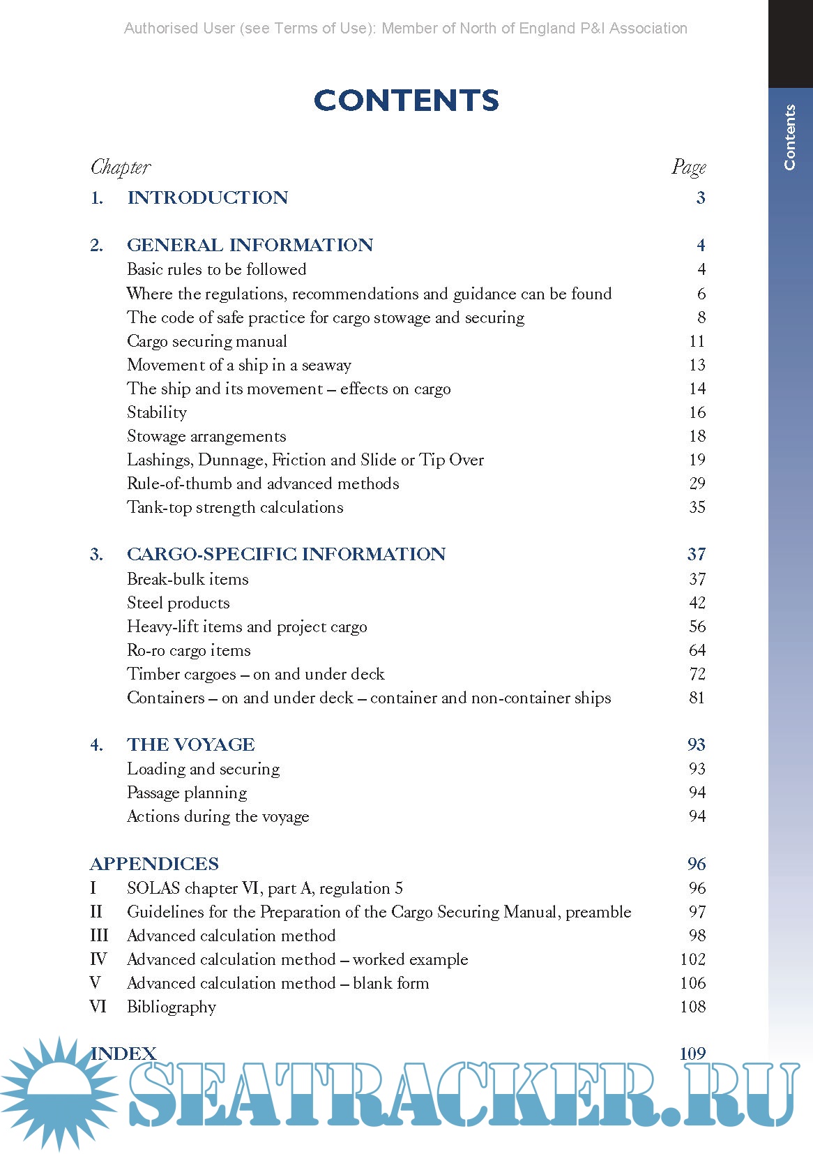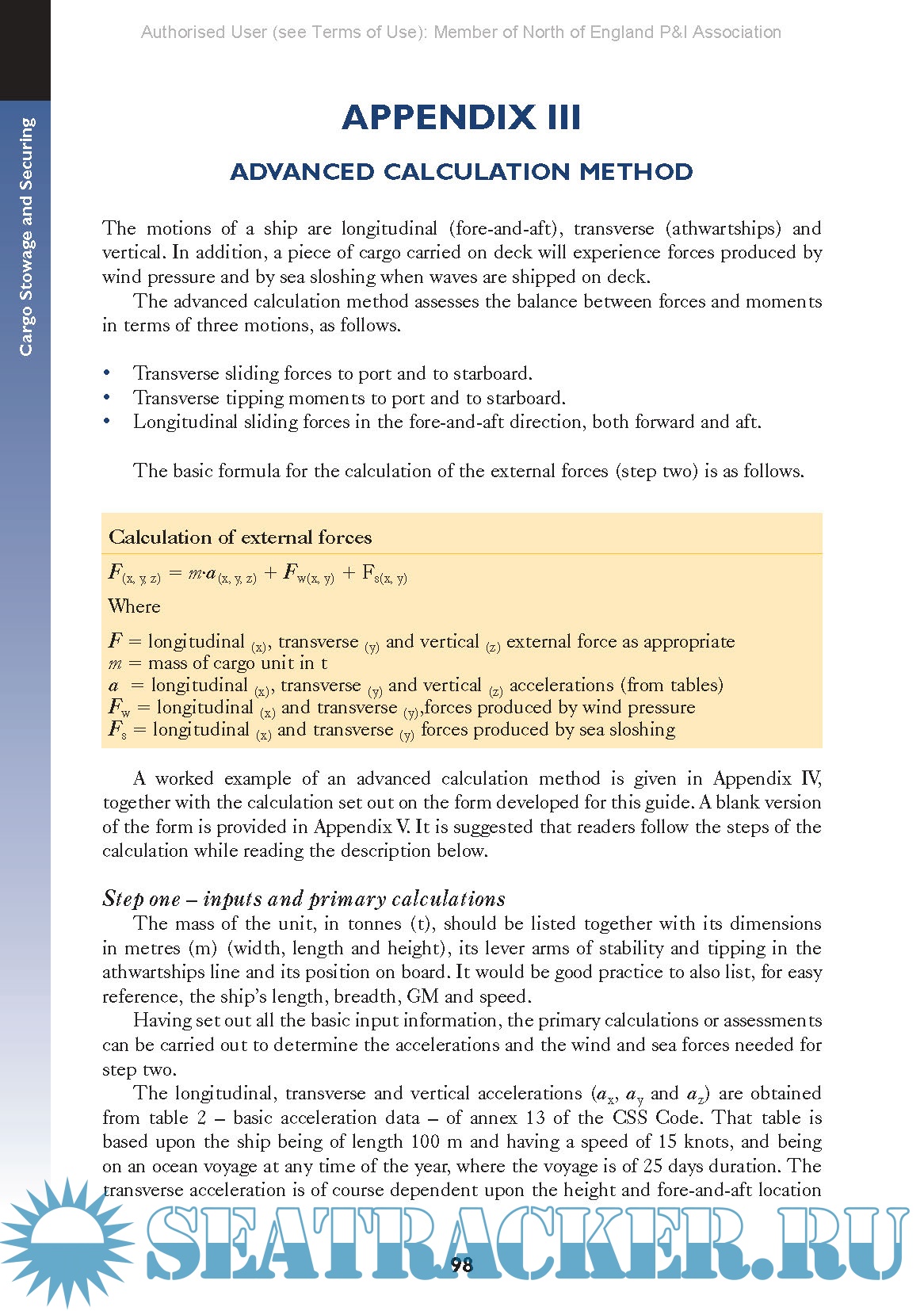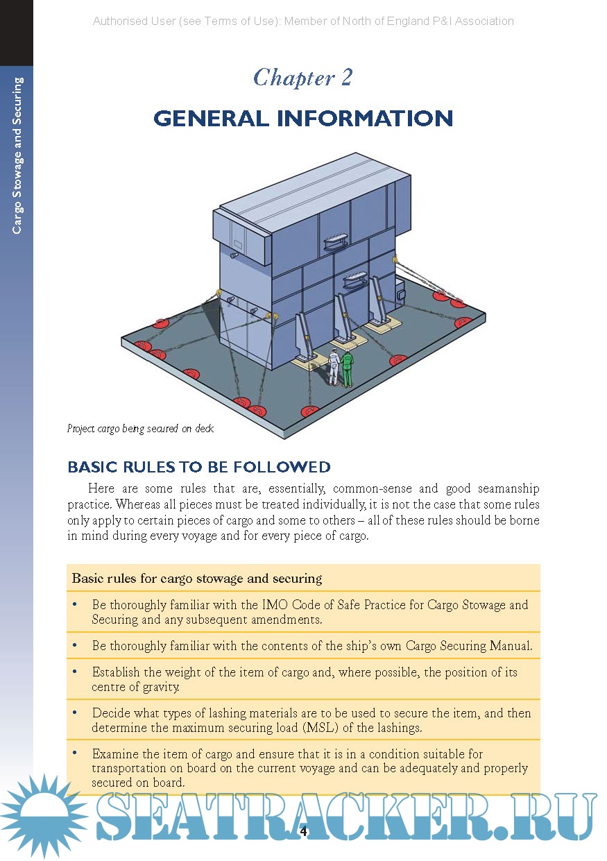 This guide will take the reader through some basic rules to be remembered on every occasion during the loading and securing of cargo, will describe where regulations, recommendations and general guidance can be found, will describe recommended methods to be used for particular items and types of cargo, and will then give some guidance upon the points to be remembered during passage-planning and the voyage itself. It is not intended that this guide will give details of precisely how to secure any particular items of cargo. It will set out the basics and point to publications that give the rules to be followed. This guide does contain information, such as for the calculation of lashings, taken from codes, but only that which is essential for the clear understanding of the text.