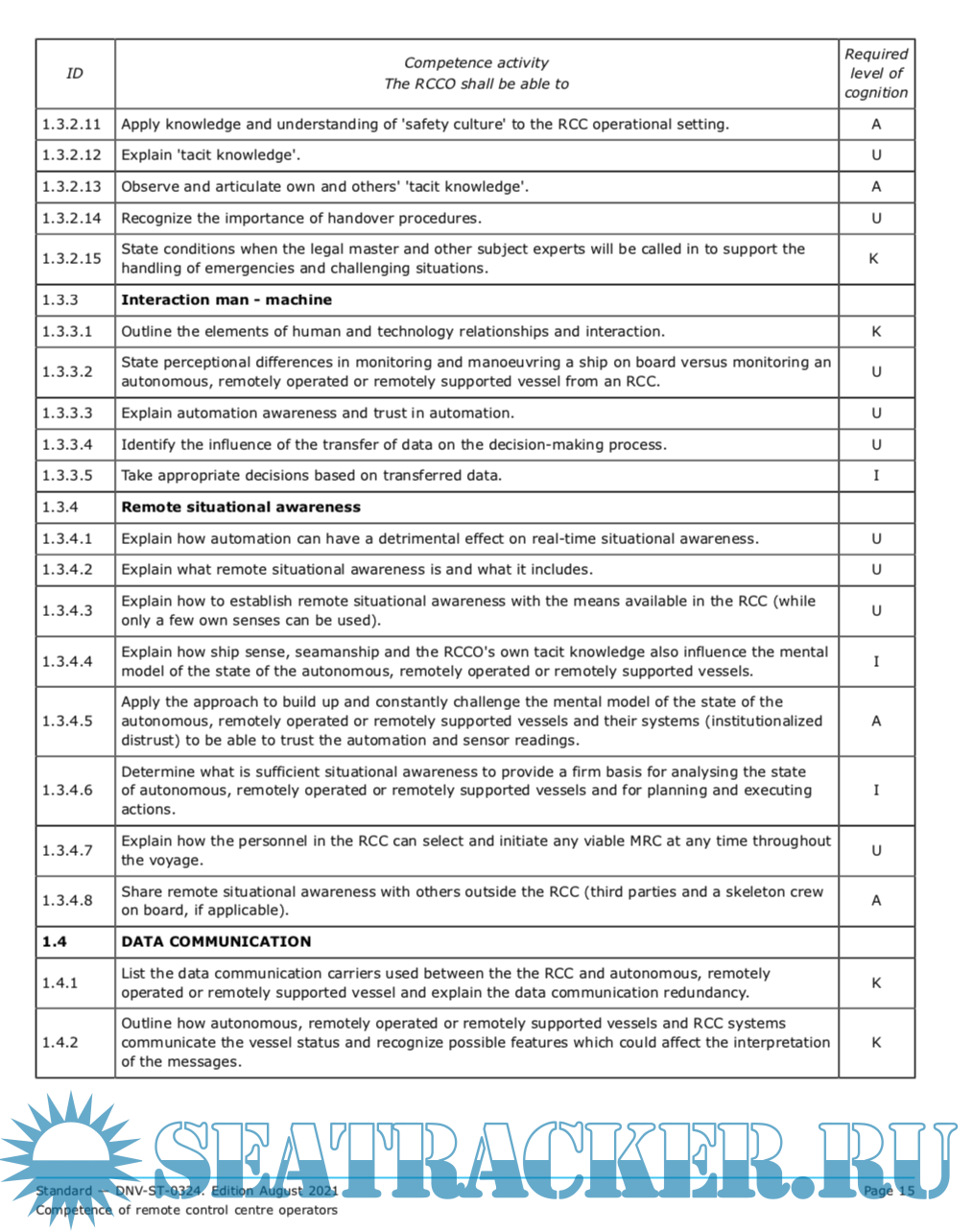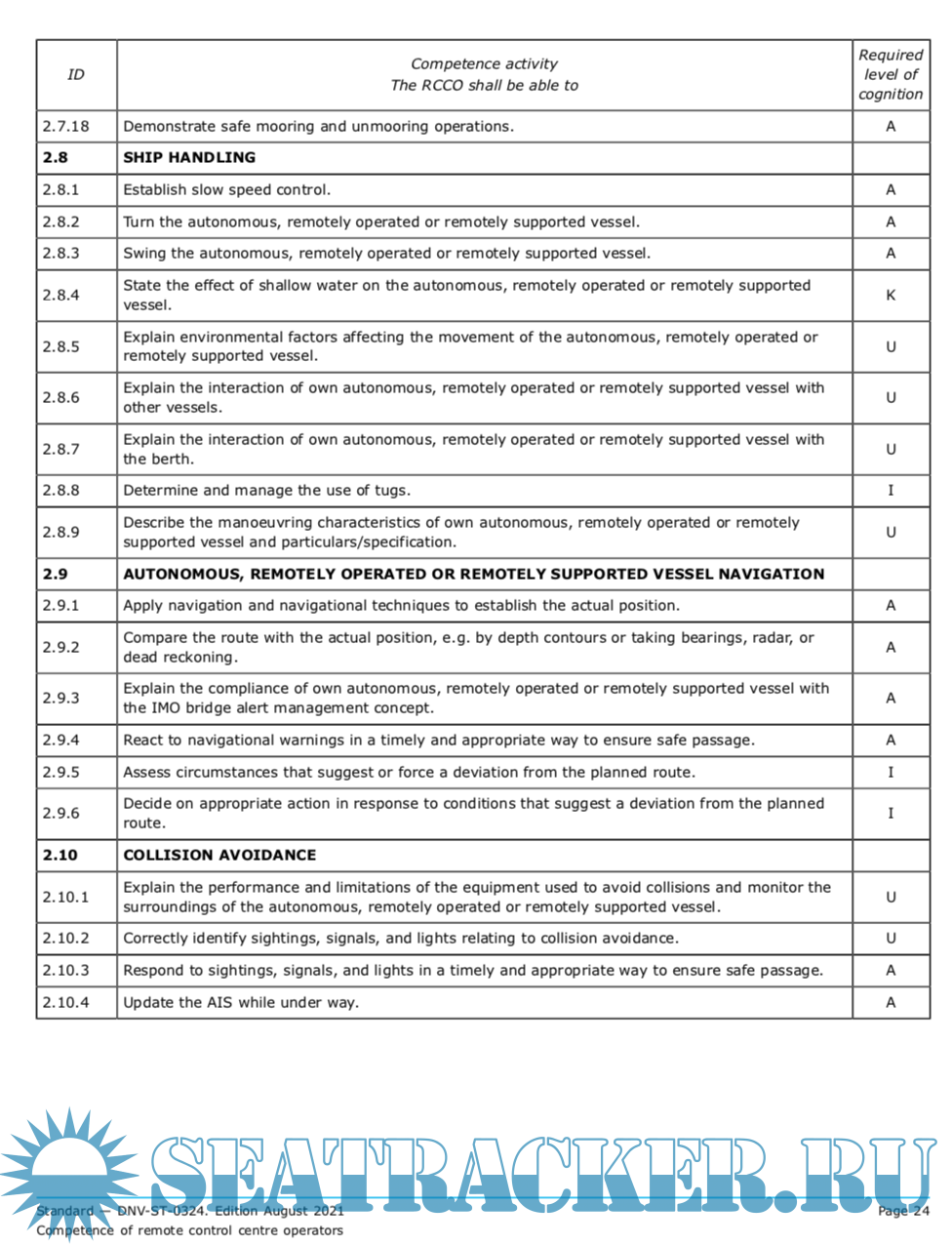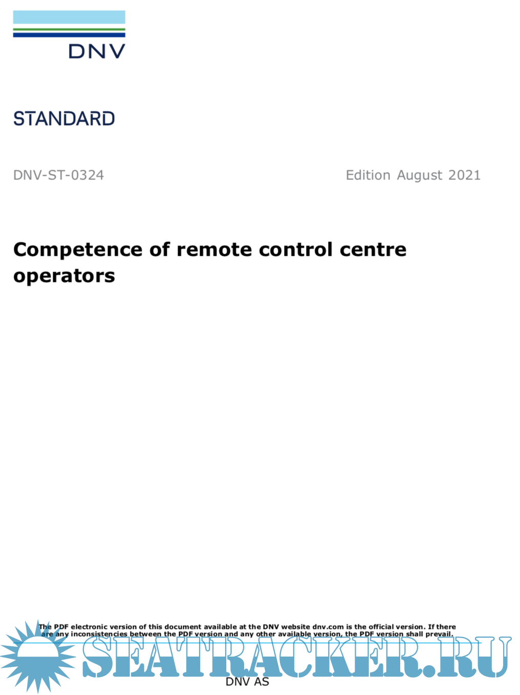 Description: The standard covers the tasks performed by a remote control centre operator (RCCO) in a remote control centre (RCC) for the monitoring and control of autonomous, remotely operated and remotely supported vessels and , identifies a base set of competencies. The standard aims to provide guidance for establishing a competence foundation, to be supplemented by e.g. operational/supplier manuals and system specific details.