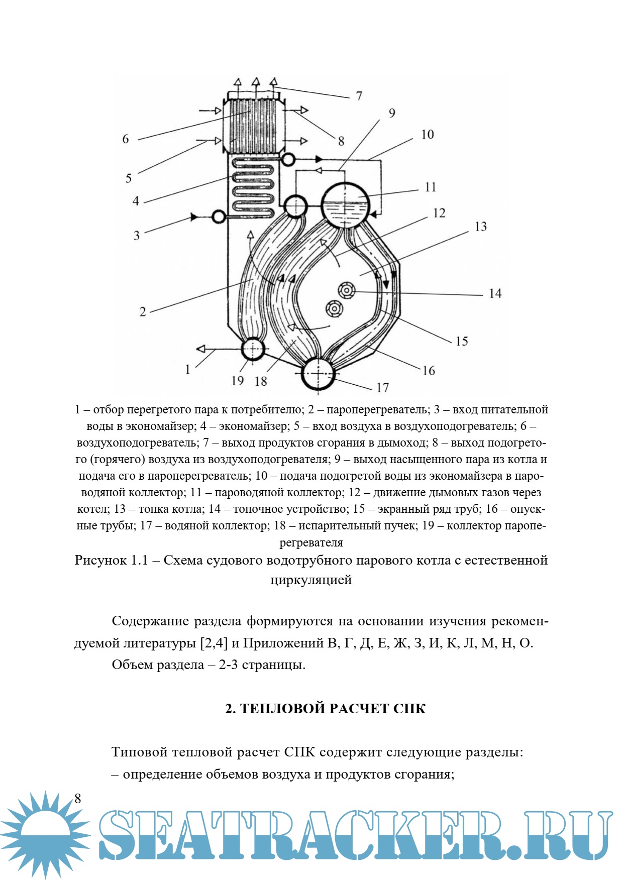 Приводятся методики теплового, прочностного, аэродинамического расчетов и анализа водного режима судового парового котла, представлены необходимые справочные мате-риалы и пример выполнения расчетов.