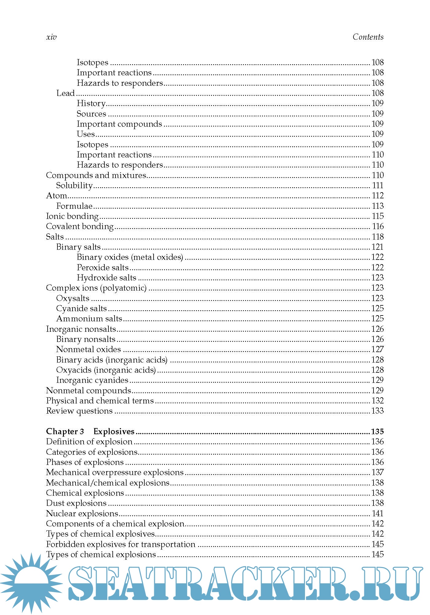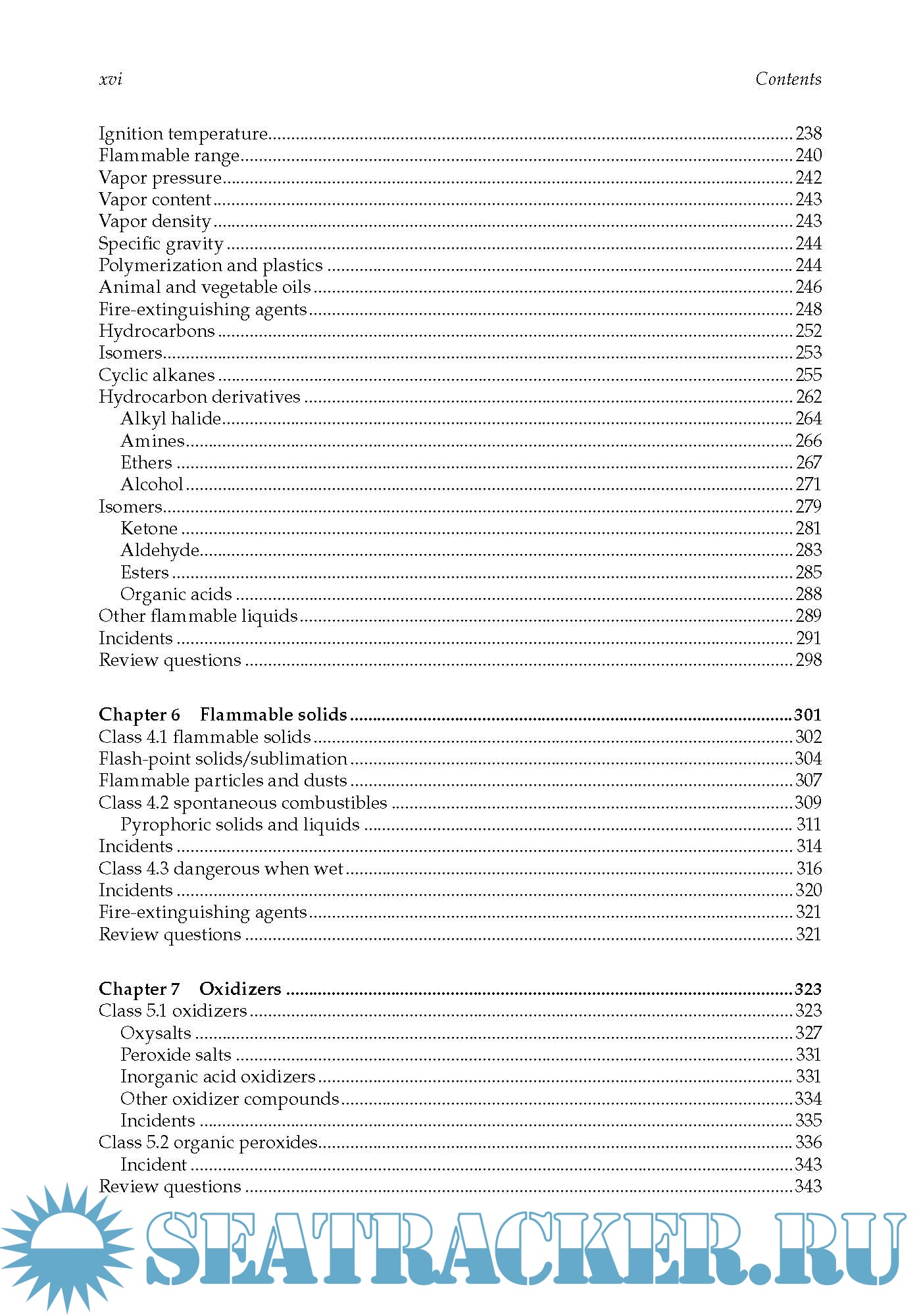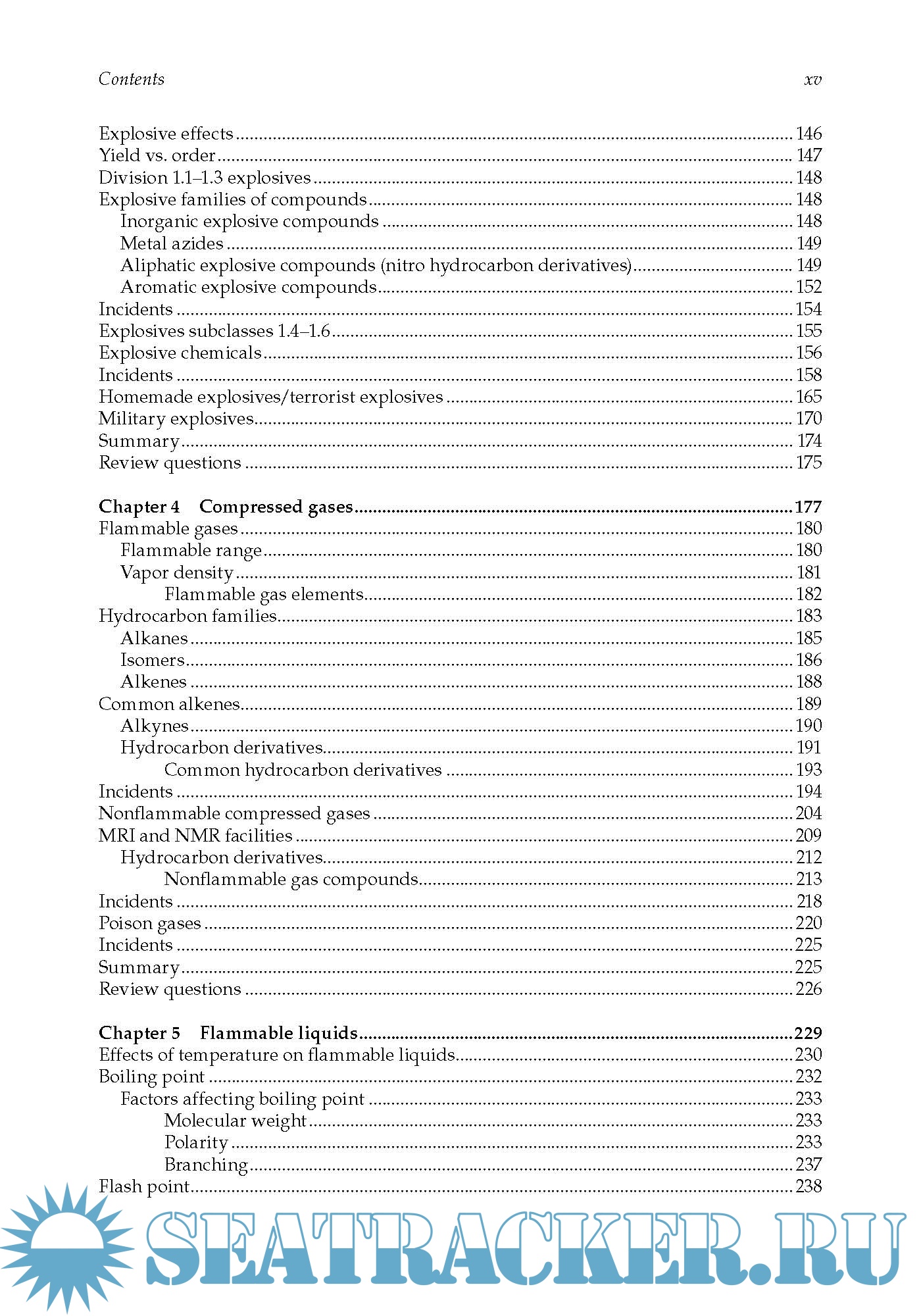 The chapters are organized by the nine U.S. Department of Transportation's hazard classes. Almost every hazardous material presents more than one hazard; the DOT’s placarding and labelling system only identifies the most severe hazards. Therefore, the book provides additional information about hidden hazards for each hazard class. It discusses individual chemicals, their hazards and their physical and chemical characteristics, both as distinct chemicals and within chemical families.