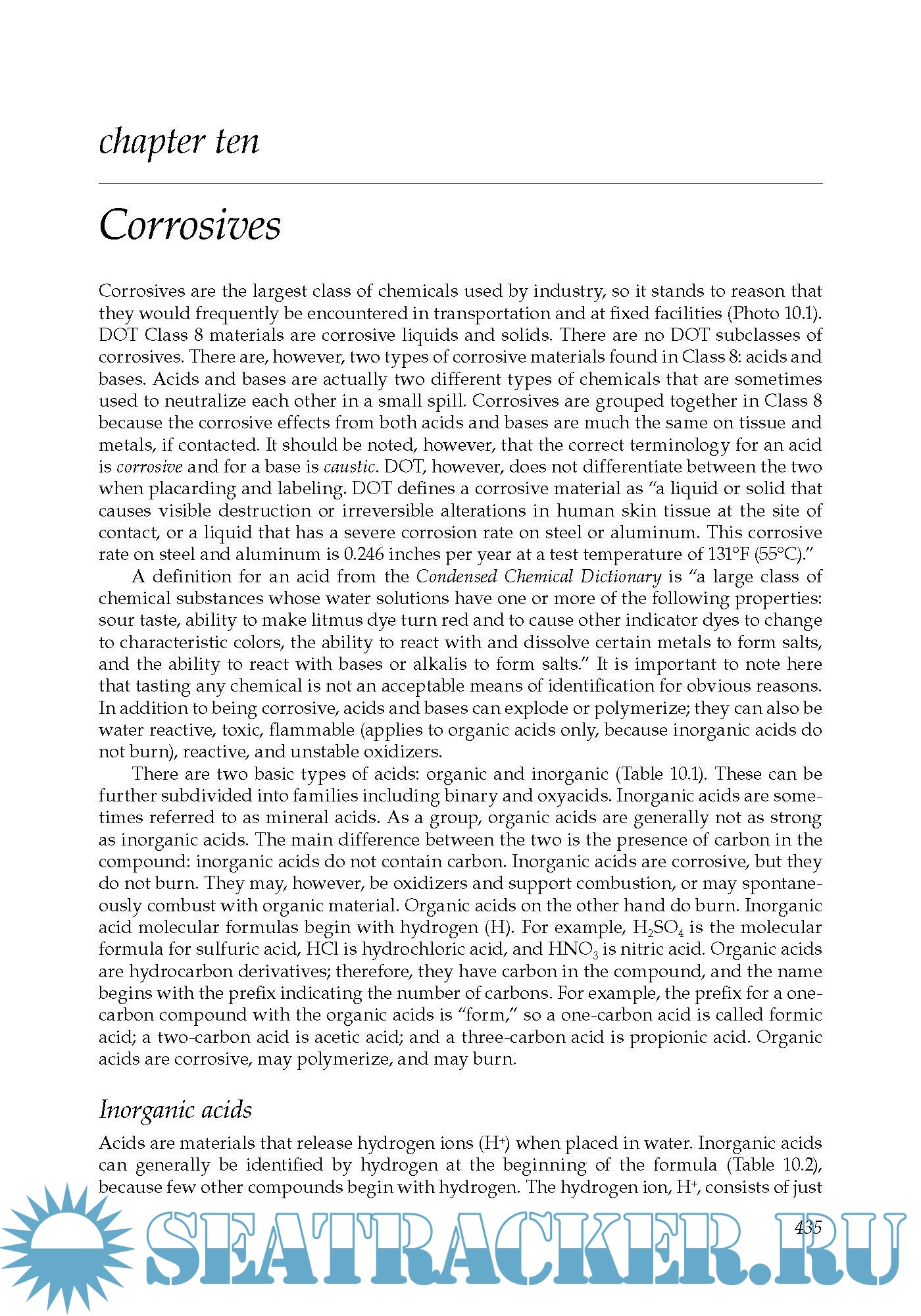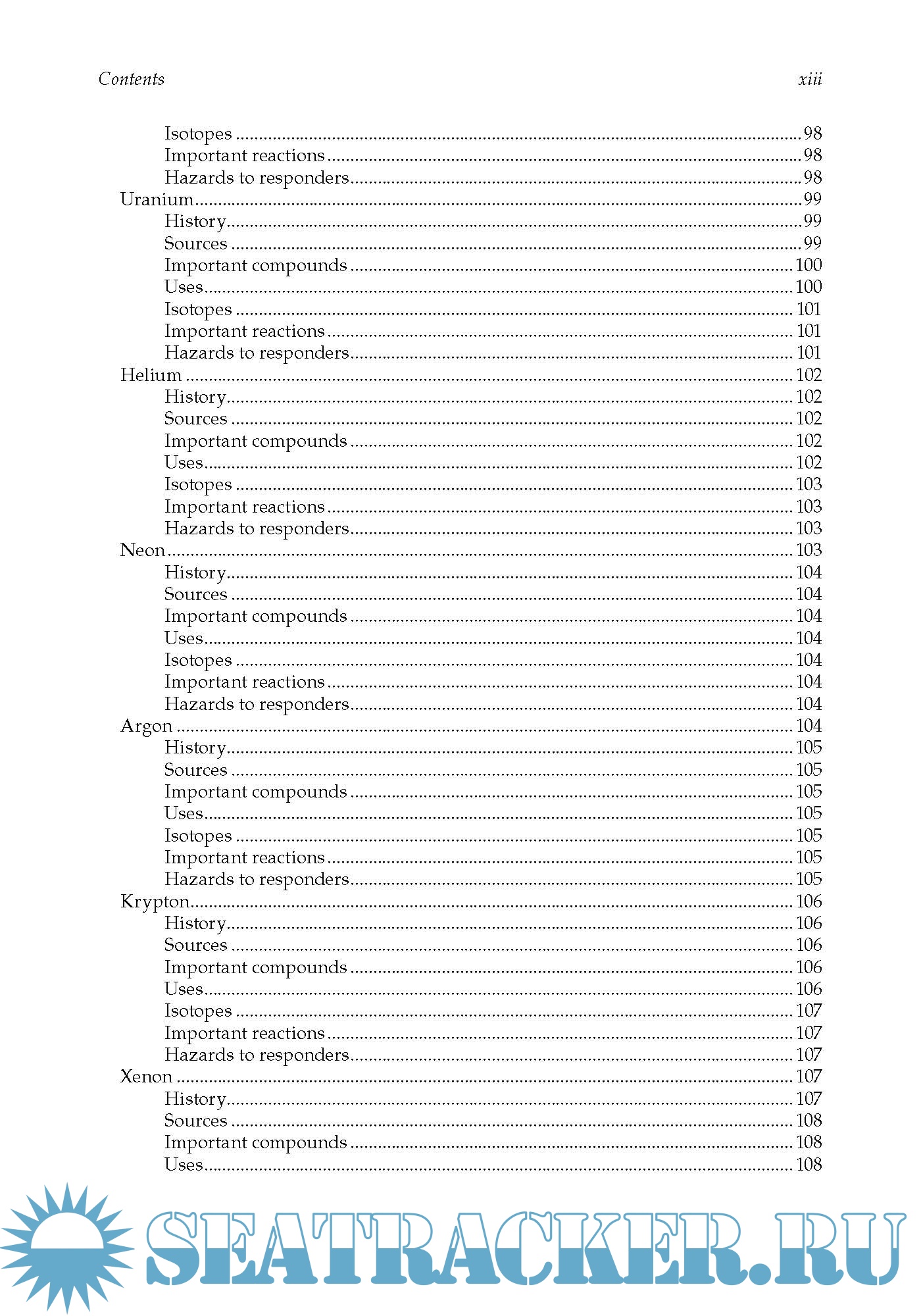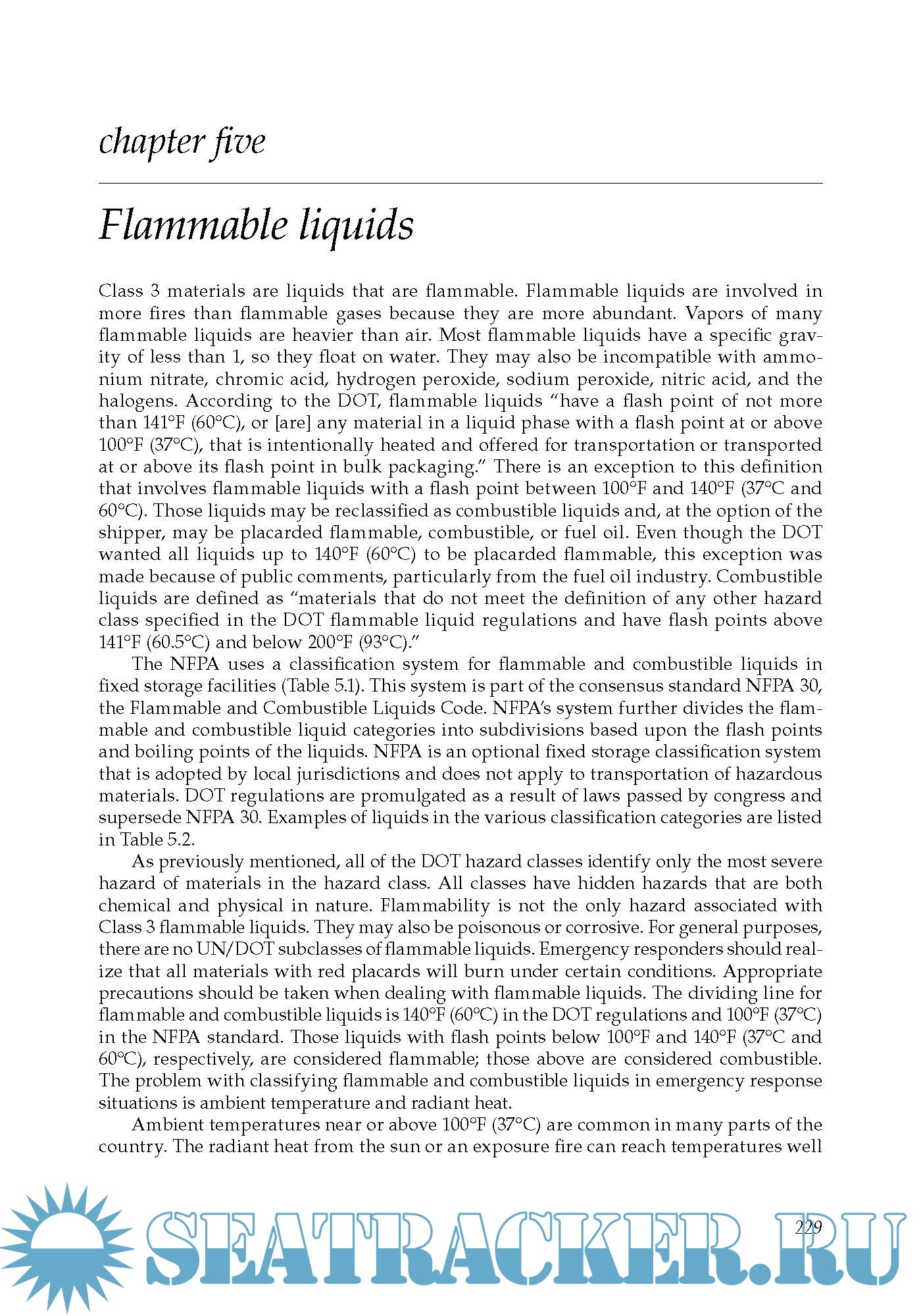 The chapters are organized by the nine U.S. Department of Transportation's hazard classes. Almost every hazardous material presents more than one hazard; the DOT’s placarding and labelling system only identifies the most severe hazards. Therefore, the book provides additional information about hidden hazards for each hazard class. It discusses individual chemicals, their hazards and their physical and chemical characteristics, both as distinct chemicals and within chemical families.