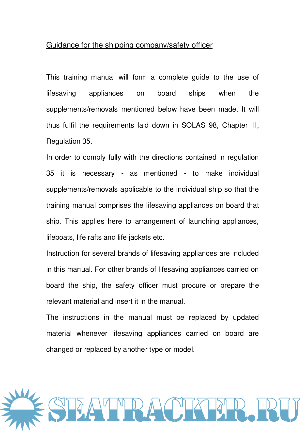 Description: This Training Manual is provided to comply with the relevant provisions of Chapter III of the 1974 SOLAS Convention, as