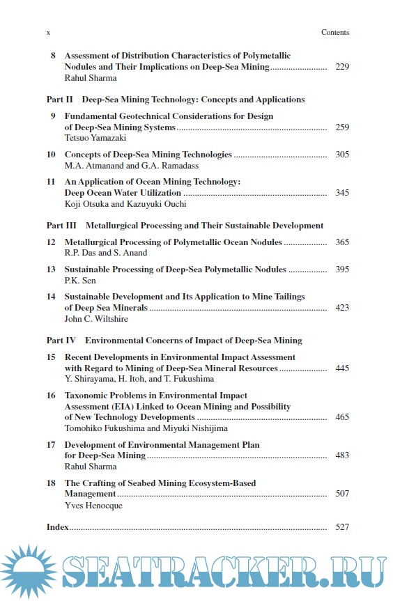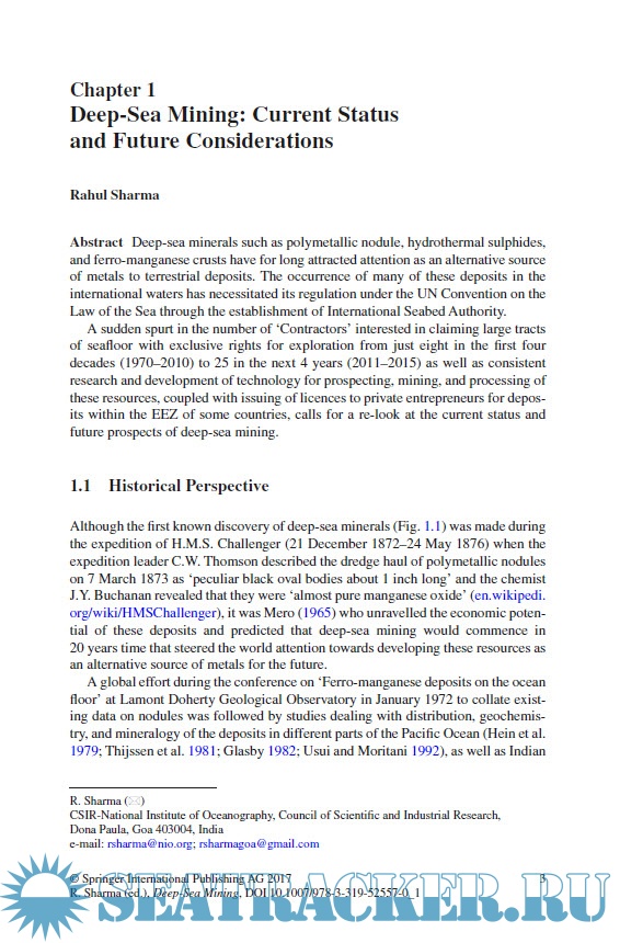Year: 2017 Language: english Author: Rahul Sharma Publisher: Springer ISBN: 978-3-319-52556-3 Format: PDF Quality: eBook Pages count: 534 Description: This comprehensive book contains contributions from specialists who provide a complete status update along with outstanding issues encompassing different topics related to deep-sea mining. Interest in exploration and exploitation of deep-sea minerals is seeing a revival due to diminishing grades and increasing costs of processing of terrestrial minerals as well as availability of several strategic metals in seabed mineral resources; it therefore becomes imperative to take stock of various issues related to deep-sea mining. The authors are experienced scientists and engineers from around the globe developing advanced technologies for mining and metallurgical extraction as well as performing deep sea exploration for several decades. They invite readers to learn about the resource potential of different deep-sea minerals, design considerations and development of mining systems, and the potential environmental impacts of mining in international waters.