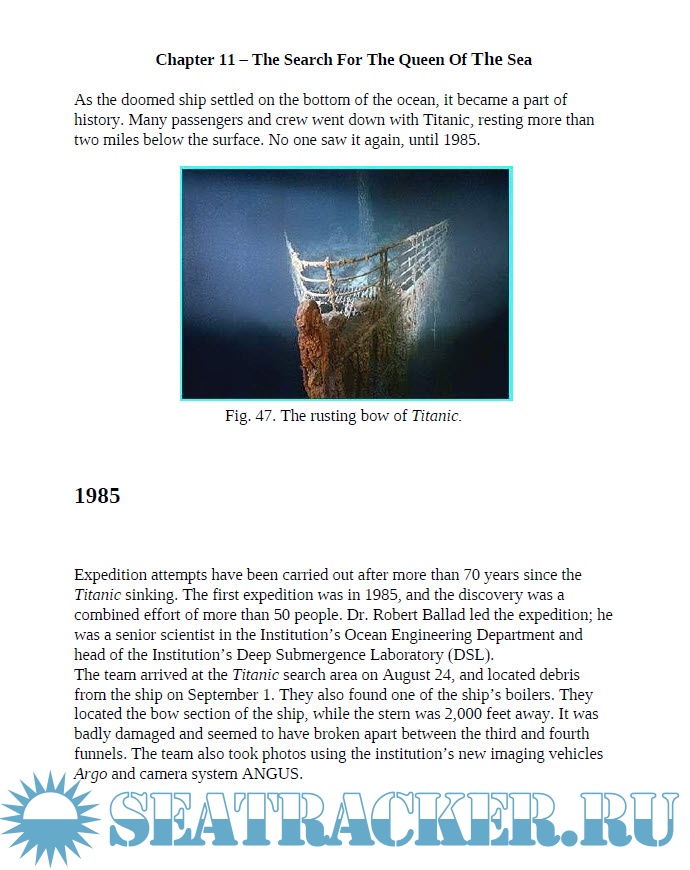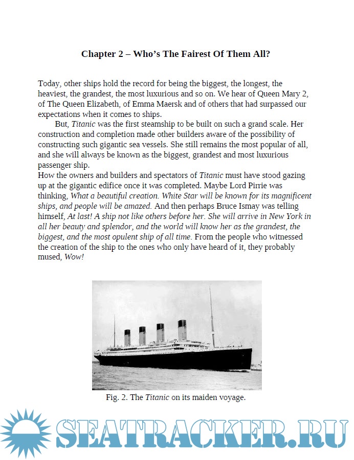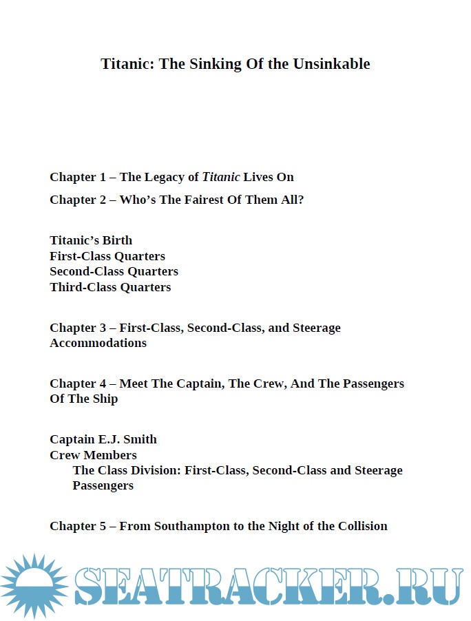 Chapter 1 - The Legacy of Titanic Lives On Chapter 2 - Who's The Fairest Of Them All? Chapter 3 - First-Class, Second-Class, and Steerage Accommodations Chapter 4 - Meet The Captain, The Crew, And The Passengers Of The Ship Chapter 5 - From Southampton to the Night of the Collision Chapter 6 - "Iceberg Right Ahead!" Chapter 7 - The Tragic Death of Titanic Chapter 8 - Californian And Carpathia To The Rescue Chapter 9 - Errors and Factors Contributing to the Sinking of Titanic Chapter 10 - Some Things You Should Know About Titanic Chapter 11 - The Search For The Queen Of The Sea