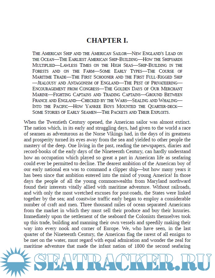 Description: When the Twentieth Century opened, the American sailor was almost extinct. The nation which, in its early and struggling days, had given to the world a race of seamen as adventurous as the Norse Vikings had, in the days of its greatness and prosperity turned its eyes away from the sea and yielded to other people the mastery of the deep. One living in the past, reading the newspapers, diaries and record-books of the early days of the Nineteenth Century, can hardly understand how an occupation which played so great a part in American life as seafaring could ever be permitted to decline. The dearest ambition of the American boy of our early national era was to command a clipper ship—but how many years it has been since that ambition entered into the mind of young America! In those days the people of all the young commonwealths from Maryland northward found their interests vitally allied with maritime adventure. Without railroads, and with only the most wretched excuses for post-roads, the States were linked together by the sea; and coastwise traffic early began to employ a considerable number of craft and men. Three thousand miles of ocean separated Americans from the market in which they must sell their produce and buy their luxuries. Immediately upon the settlement of the seaboard the Colonists themselves took up this trade, building and manning their own vessels and speedily making their way into every nook and corner of Europe. We, who have seen, in the last quarter of the Nineteenth Century, the American flag the rarest of all ensigns to be met on the water, must regard with equal admiration and wonder the zeal for maritime adventure that made the infant nation of 1800 the second seafaring people in point of number of vessels, and second to none in energy and enterprise.