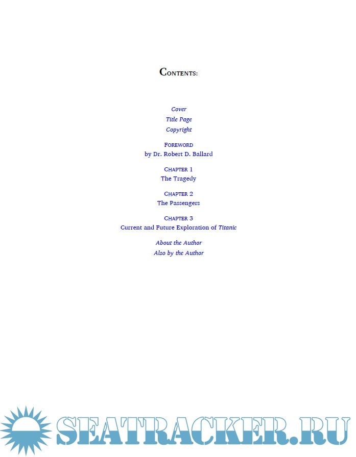 Year: 2012 Language: english Author: National Geographic Publisher: National Geographic Society ISBN: 978-1-42620979-6 Format: PDF Quality: OCR with errors Pages count: 47 Description: On the 100th anniversary of Titanic's sinking, National Geographic revisits the romance, glory, and tragedy of this tremendous ship and presents an insider’s look at the new findings about the passengers and scientific study of the wreck site. For 100 years the great ship Titanic has rested in its final grave on the ocean floor, lost to deep ocean darkness until its 1985 discovery by National Geographic’s Bob Ballard. Relive the spell-binding tragic final hours of the ship in a detailed retelling of the famous story and learn the personal stories of lesser-known passengers, including the “guarantees.” For the first time since its discovery, Ballard travels to Belfast to interview descendants of the ship builders and the “guarantee group”—the ill-fated men who traveled on the ship’s first voyage to assure its seaworthiness. Understand underwater mapping techniques that have brought Titanic’s debris field into high resolution, and get a glimpse of current deep ocean scientific research on the wreckage and the future of underwater exploration.