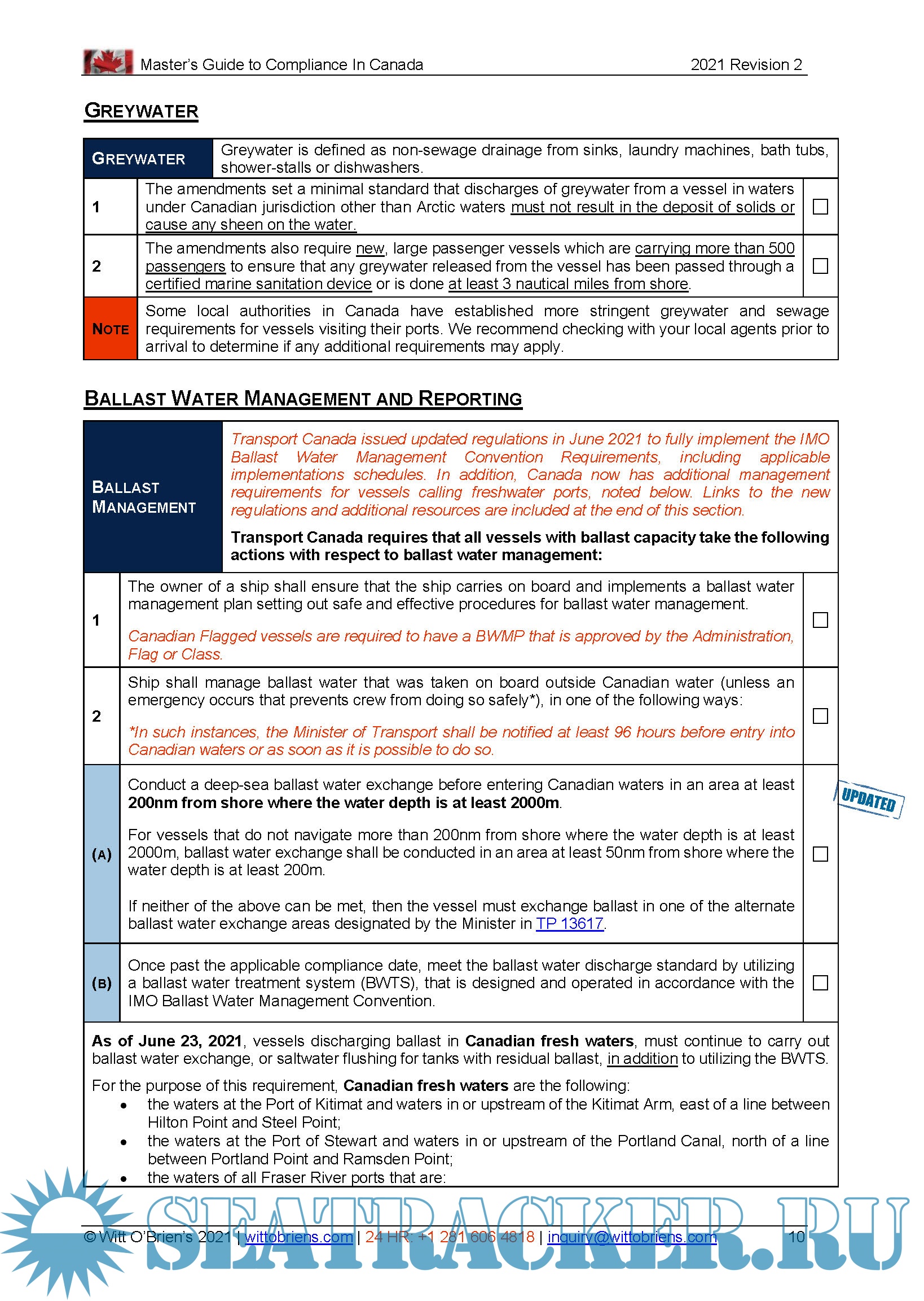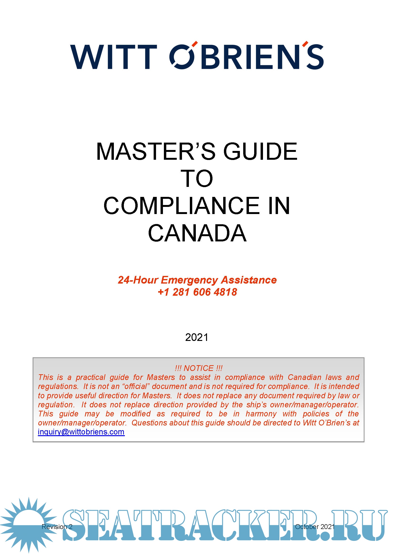 Year: 2021 Language: english Author: Witt O'Brien's Genre: Guide Format: PDF Quality: eBook Pages count: 15 Description: Revision 2 dated October 2021 of Master's Guide to Compliance in Canada This is a practical guide for Masters to assist in compliance with Canadian laws and regulations. It is not an “official” document and is not required for compliance. It is intended to provide useful direction for Masters. It does not replace any document required by law or regulation. It does not replace direction provided by the ship’s owner/manager/operator. This guide may be modified as required to be in harmony with policies of the owner/manager/operator. The Master of any vessel making a call to Canada faces several regulatory issues that are specific to Canada. This guide is intended to help the Master effectively and efficiently face these issues. Witt O’Brien’s is providing this guide to help ensure your compliance. Use of the directions in the guide will allow Witt O’Brien’s to better serve you. Information designed to save you time and effort is present in orange italics