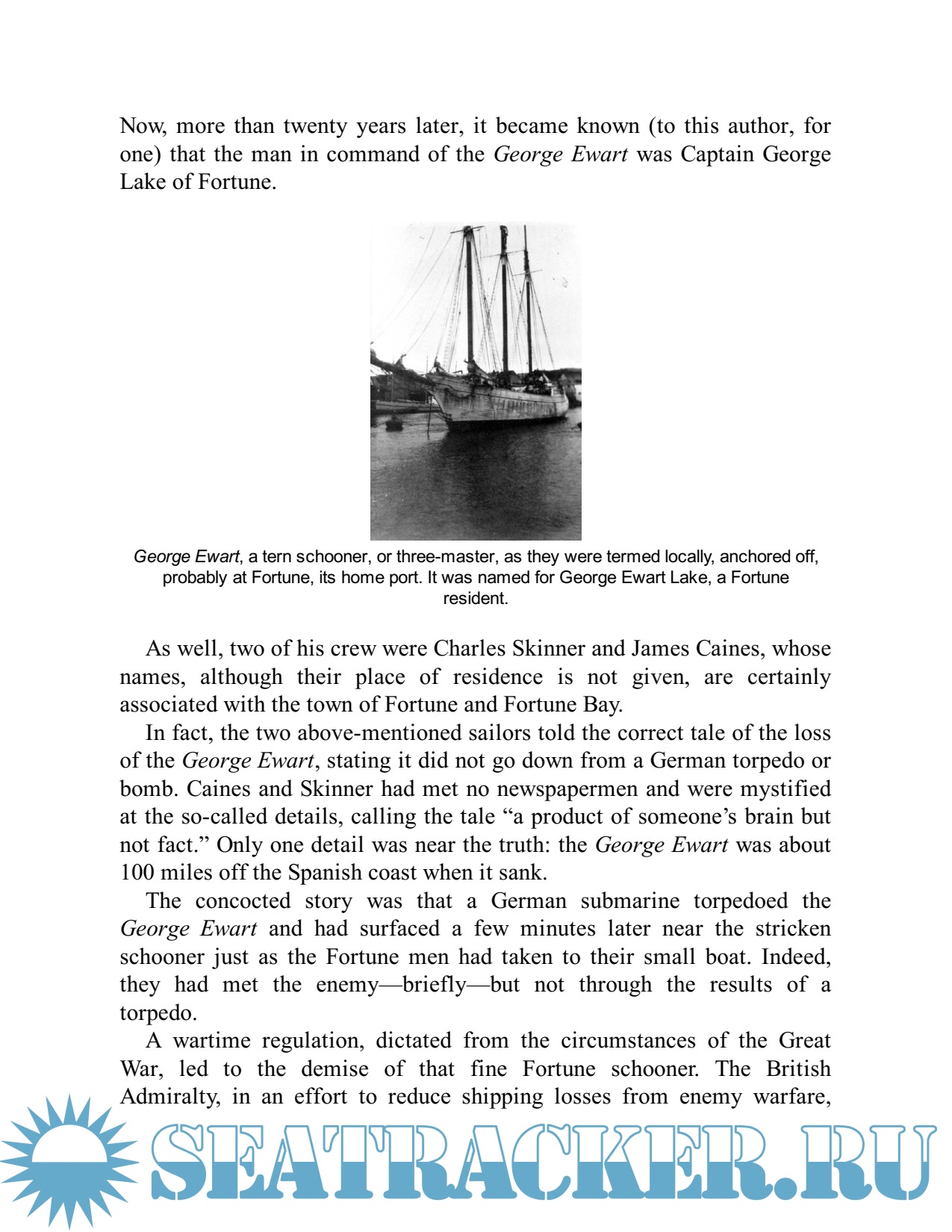 George Lake of Fortune, captain of the schooner George Ewart, who narrowly escaped death when an iron steamer smashed into his vessel off the coast of Spain in 1917