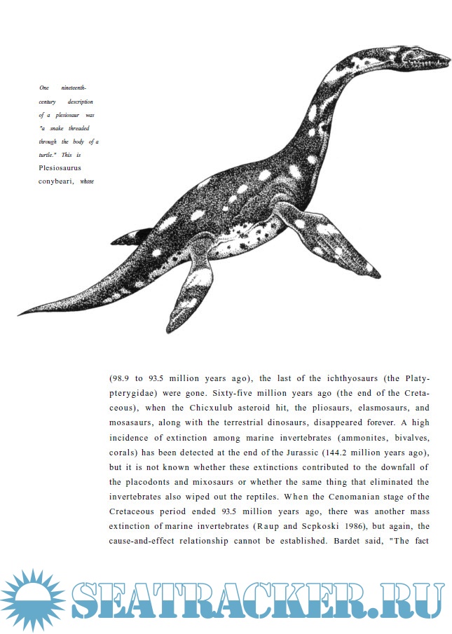 Picture if you will seventy-foot dragons with foot-long serrated teeth, or an animal that looked like a crocodile crossed with a shark the size of a small yacht. With its impossibly long neck, Plesiosaurus conybeari has been compared to "a giant snake threaded through the body of a turtle." At a length of nearly sixty feet, Mosasaurus hoffmanni boasted powerful jaws and teeth that could crunch up even the hardest-shelled giant sea turtle. And Kronosaurus queenslandicus, perhaps the most formidable of the lot, had a skull nine feet long more than twice that of Tyrannosaurus Rex with teeth to match.