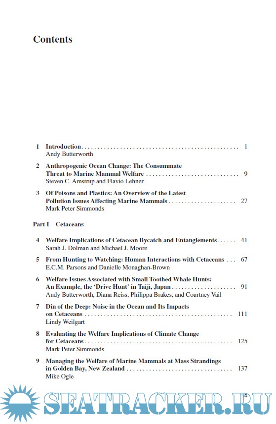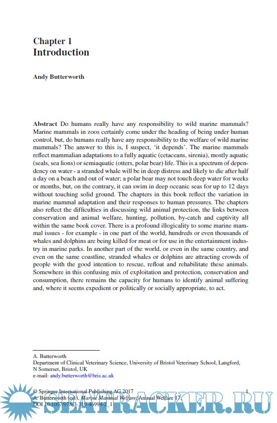 Year: 2018 Language: english Author: Andy Butterworth Publisher: Springer ISBN: 978-3-319-46994-2 Format: PDF Quality: eBook Pages count: 625 Description: Marine mammals attract human interest – sometimes this interest is benign or positive – whale watching, conservation programmes for whales, seals, otters, and efforts to clear beaches of marine debris are seen as proactive steps to support these animals. However, there are many forces operating to affect adversely the lives of whales, seals, manatees, otters and polar bears – and this book explores how the welfare of marine mammals has been affected and how they have adapted, moved, responded and sometimes suffered as a result of the changing marine and human world around them. Marine mammal welfare addresses the welfare effects of marine debris, of human traffic in the oceans, of noise, of hunting, of whale watching and tourism, and of some of the less obvious impacts on marine mammals – on their social structures, on their behaviours and migration, and also of the effects on captivity for animals kept in zoos and aquaria. There is much to think and talk about – how marine mammals respond in a world dramatically influenced by man, how are their social structures affected and how is their welfare impacted?