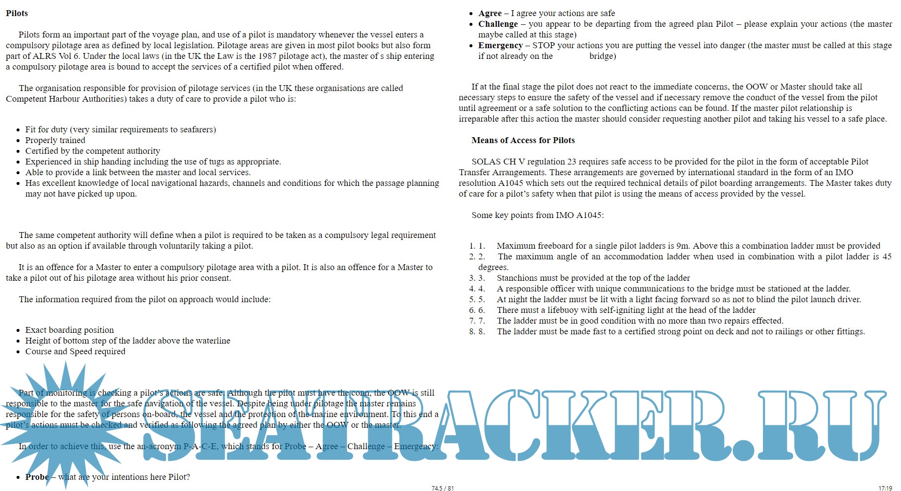 Year: 2017 Language: english Author: Barry Sadler Genre: Guide Format: EPUB Quality: eBook Pages count: 81 Description: This annotated and illustrated, essential guide ensures the reader develops an understanding of the principles of Passage Planning. It's straightforward, concise explanations are aimed to help all deck officers of every rank, including first CoC Deck Hands. The book covers all aspects of passage planning from Appraisal through to Monitoring and aims to, not only, ensure understanding but, how to effectively implement safe, up to date practice on board the bridge of a a ship or yacht. This book can be used an a stand alone publication but also as part of a series of study aids designed to develop a candidates knowledge when undertaking any deck officer orals exam, regardless of tonnage or level.
