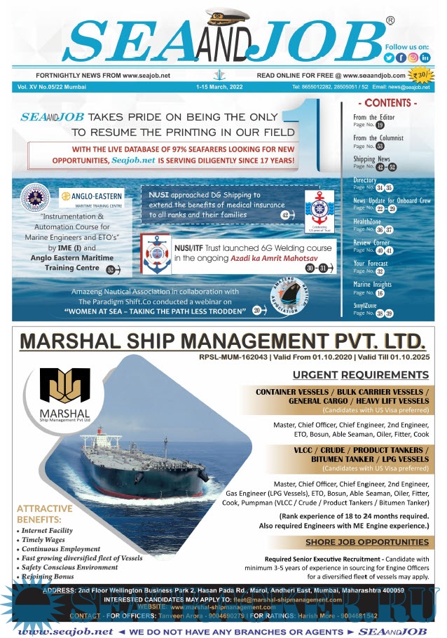 Description: The Sea and Job magazine launched in May 2007, was the second venture of Sea Line Group succeeding Seajob.netBringing the much renowned essence to the Group, the Sea and Job Magazine quickly gained popularity, becoming the No. 1 Shipping Magazine that came to be widely circulated all over India. Sea and Job over the years has evolved as the most trusted, ethical, objective and read maritime publication that possesses a large database of subscribers from various verticals in the industry. The magazine provides informative and interesting articles covering not just the shipping world but also the world outside it. Sea and Job is also a medium for the shipping/ manning companies to advertise marine jobs and also to promote their organization by publicizing internal activities like seminars, sports events and parties.Some notable endeavors of the magazine include the Know Your Recruiter Column, the Sailing Episodes Column and the Marine Insights section. The consistent efforts and the dedication to provide extraordinary services to the industry has resulted in the magnifying popularity and patronage of Sea and Job Magazine currently extending to 70-72 pages.