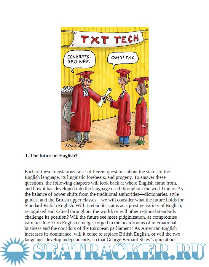 Year: 2018 Language: english Author: Simon Horobin Publisher: Oxford University Press ISBN: 978–0–19–101932–6 Format: PDF Quality: eBook Pages count: 189 Description: The English language is spoken by more than a billion people throughout the world. But where did English come from? And how has it evolved into the language used today? In this Very Short Introduction Simon Horobin investigates how we have arrived at the English we know today, and celebrates the way new speakers and new uses mean that it continues to adapt. Engaging with contemporary concerns about correctness, Horobin considers whether such changes are improvements, or evidence of slipping standards. What is the future for the English language? Will Standard English continue to hold sway, or we are witnessing its replacement by newly emerging Englishes?