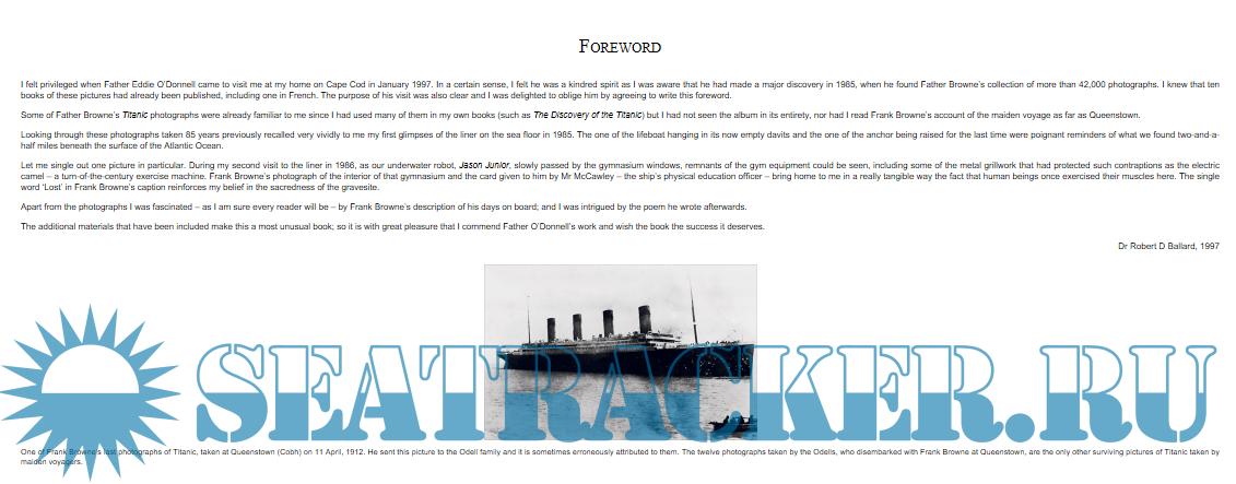 Description: As a passenger on the first two legs of Titanic's ill fated voyage, Father Francis Browne SJ's photographs are an immensely important record. As well as taking a unique set of photos, Father Browne also assembled an incredibly valuable album of Titanic material such as an original deck plan, menus, letters to him from fellow passengers, contemporary newspaper cuttings and other documents, many of which are reproduced here.