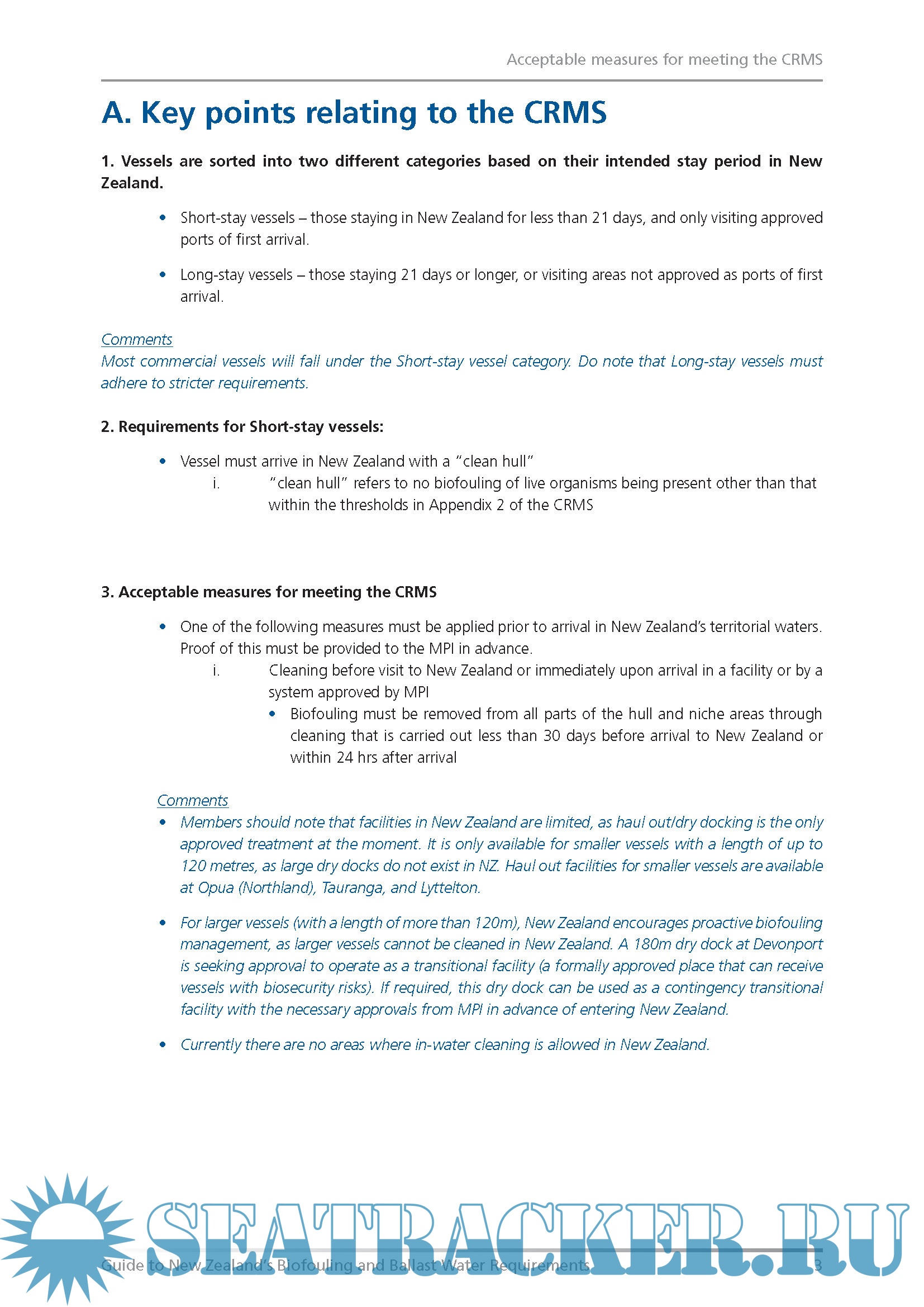 Year: 2019 Language: english Author: INTERTANKO Genre: Guide Format: PDF Quality: eBook Pages count: 9 Description: Members’ experiences with New Zealand’s biofouling regulations (Craft Risk Management Standard – CRMS) were up for discussion at the September 2018 meeting of INTERTANKO’s Environmental Committee. It was noted that the New Zealand Ministry of Primary Industries (MPI) has issued Notices of Direction to vessels informing them to stay outside New Zealand territorial waters until their hulls are cleaned; this being despite the fact that there are no cleaning facilities in New Zealand. As a result of this, the Environmental Committee supported the need to open a dialogue with the New Zealand authorities on the issue and, following the INTERTANKO Secretariat’s engagement with New Zealand’s MPI, the latter provided relevant information that Members should take note of and which has been included in this Guide.