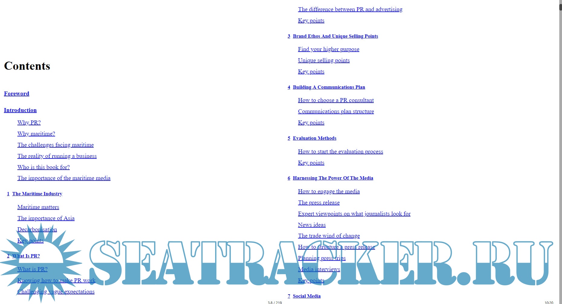Year: 2021 Language: english Author: Ben Pinnington Genre: Guide Publisher: ReThink Press Format: EPUB Quality: eBook Pages count: 219 Description: Making Waves is an insider’s guide to public relations in the international maritime sector. It sets out in clear, practical steps how you can harness the power of PR to build your profile, win business and prevent crises. Read this book to reap seven rewards of public relations: • Improve reputation: Learn how to influence attitudes and behaviours and build good relations. • Grow awareness: Boost your profile in the local, national and international maritime press and on social media. • Create opportunities: Reach a global audience beyond the limits of your existing network. • Work with key people: Build the profile of your senior team as key people of influence in your niche. • Increase value: Improve the value of your business and increase your price points. • Protect your business: Shield your business from crises through planning. • Find higher purpose: Identify an inspiring ethos and bold message that will galvanise your team, clients and stakeholders. Drive real change in your industry.